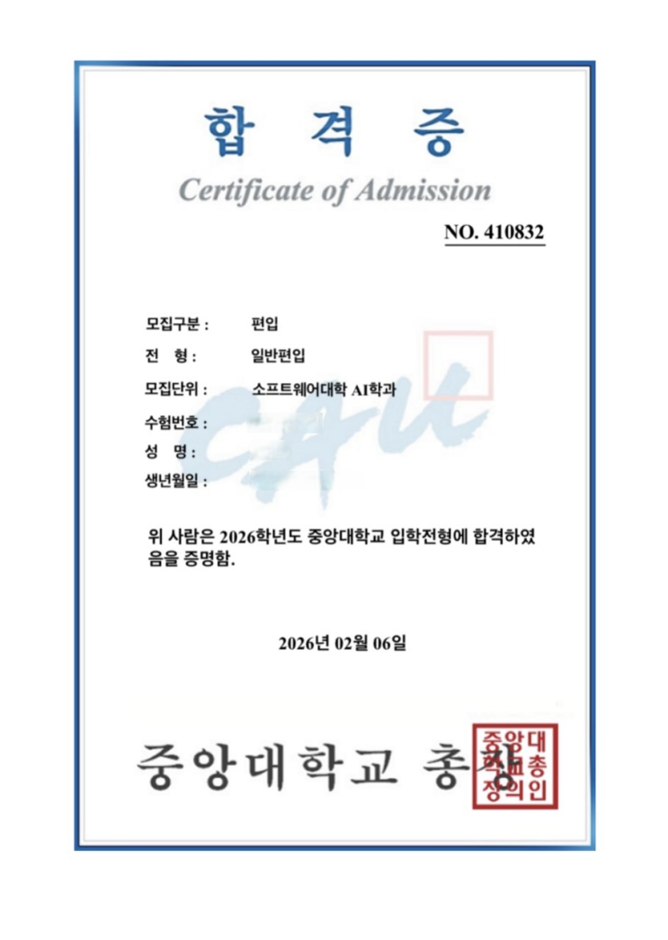 안녕하세요. 이번에 부평캠퍼스에서 수강해서 중앙대학교 소프트웨어대학 AI학과에 합격한 윤OO입니다. 저는 부평캠퍼스에서 1월부터 수강하여 중앙대, 건국대, 동국대, 국민대, 숭실대, 경기대, 가천대, 항공대에 최종 합격하였습니다. 우선 저의 학원 생활과 공부 방법에 대해 말씀드리면 저는 '최대한 학원에 오래 있자'는 목표를 가지고 수험생활에 임했습니다. 집에 가게 되면 공부를 안 하고 놀게 되기 때문에 월화수목금 평일에는 최대한 학원에 오래 있는 것을 목표로 삼았습니다. 다만 주말에는 공부보다는 휴식에 집중하며 컨디션 조절에도 신경 썼습니다. 그래서 수업 시간 포함하여 순공부 시간은 하루에 최소 8시간에서 1....... <img src="https://blogthumb.pstatic.net/MjAyNjAyMjRfMTk0/MDAxNzcxODkxNzcwNjMw.Eaq-053gPgBfZd6e5KRPgUXfnb_2BCGMM6f3g1S_B9sg.rOa8ZdgosNCk3Whj_4Kw9HJXH_Rb0Ffp20IRv3s9GUAg.PNG/%C1%DF%BE%D3%B4%EB_%C0%B1%BA%B4%B1%C7.png?type=s3" />