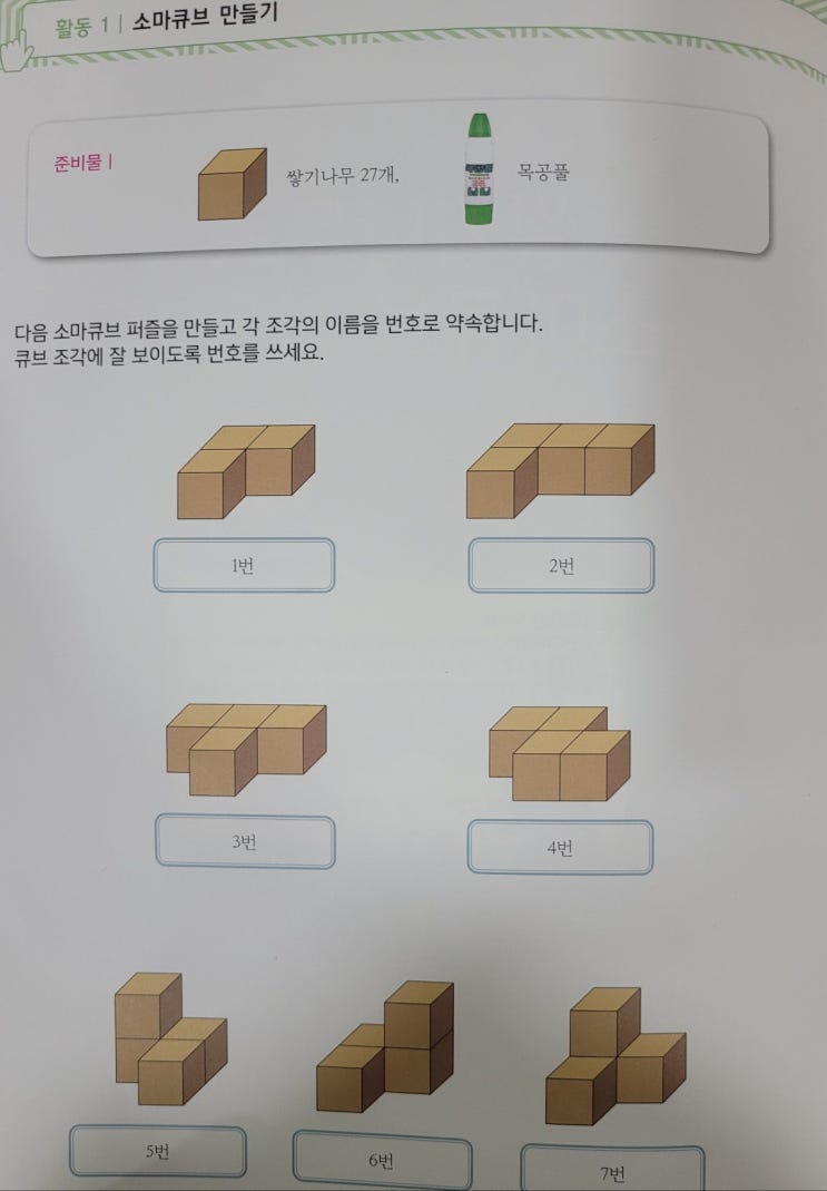초등 5학년 학생들과 4차시 동안 몬스터매스 E-1 소마큐브 특강을 진행하였습니다. 소마큐브는 3*3*3 정육면체 모양을 만들 수 있는 7개의 조각으로 1933년 덴마크의 시인이자 학자인 피에트 하인(Piet Heins)이 만든 퍼즐입니다. 1번 조각은 쌓기 나무 3개(트리오미노), 나머지 6조각은 모두 쌓기나무 4개(테트로미노)로 이루어져 있습니다. 소마큐브 수업은 단순한 퍼즐 맞추기를 넘어 입체 도형의 성질을 탐구하게 하며, 겉넓이 구하기와 등각투시도 학습을 통해 공간지각력, 수학적 추론 능력, 규칙 발견 능력을 크게 향상시킵니다. 두 활동은 서로 보완적이며, 함께 활용할 때 아이들의 입체적 사고와 수학적 탐구심을 크게 키울 수 있습니....... <img src="https://blogthumb.pstatic.net/MjAyNjAxMTJfMjEy/MDAxNzY4MjEwNTIzNDgx.Ke4-qPV6SzaE4kmVTMzrJm9yPH_LLhPKEXAr5pG43_Qg.UpGKgjDatNjhTRQhH0o3CgonTg8rgbZVHTKqTqiATCMg.JPEG/1.jpg?type=s3" />