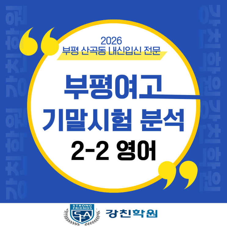 안녕하세요, 강친학원부평캠퍼스입니다. 부평여고 2학년 영어 기말고사는 지문의 난이도가 높고 다루는 소재가 매우 전문적이어서, 학생들에게 논리적 사고력을 발휘할 것을 요구한 시험이었습니다. 단순한 일상 대화가 아닌 학문적이고 비판적인 사고를 요구하는 지문들이 주를 이뤘으며, 선택형과 서답형 모두에서 정교한 영어 실력을 평가했습니다. 이런 유형의 시험에서 고득점을 받기 위해서는 지문의 논리적 구조 이해와 심화 문법 지식이 필수입니다. 부평 중고등입시내신전문학원 강친학원에서 꼼꼼한 분석한 내용을 확인해보시고, 관련하여 궁금하신 점은 언제든지 학원으로 상담주시기 바랍니다. 2025 부평여고 2학년 영어 기말 핵심 요....... <img src="https://blogthumb.pstatic.net/MjAyNjAxMTRfMTEx/MDAxNzY4MzkzNjY1OTgy.fTwfYClN2fRnSlZCzNsKLsQpDr8Er5j2TH3VfckjSMIg.KSwAfNmkVj_BX0s1RJaSfKiNMp6h8HisYaL5W1XcToEg.PNG/1.png?type=s3" />