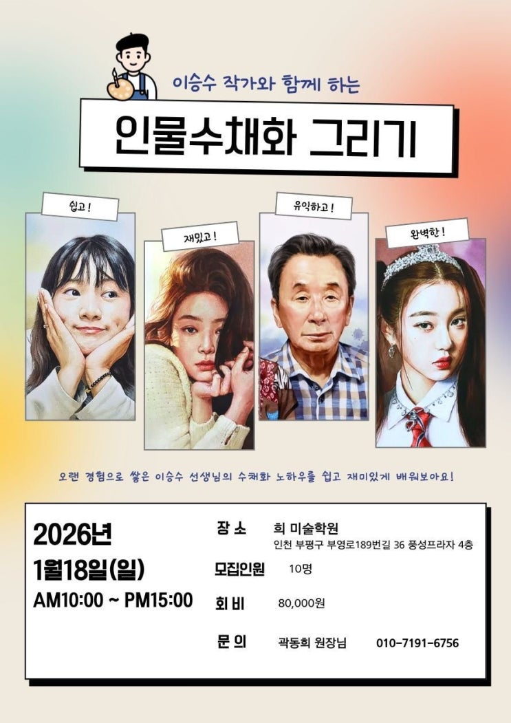 희미술에서 주관하는 인물화수업 미술학원 원장님들 수업 강좌 입니다 아이들에게 쉽게하는 티칭 방법전수 수채화전문 작가님의 티칭 노하우 배워봅시당 <img src="https://blogthumb.pstatic.net/MjAyNjAxMTRfMjgz/MDAxNzY4Mzg2MDgwNjM5.KeTVBGIdCKM4F-BK1mlGjFBObkepZwOPO94_Qnn-mW4g.hgOSYnHfwAXYQJd3n_z0tJgfM6Juz7ReoQ2f6Gmlxc0g.JPEG/3472595310662622816.jpg?type=s3" />