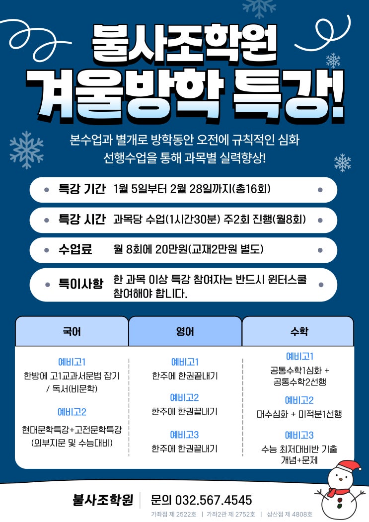 안녕하세요 중고등 입시학원 불사조 학원입니다. 불사조학원에서는 1월 5일부터 2월 28일까지 고등부 겨울방학 특강 및 윈터스쿨을 진행합니다! 겨울특강은 국어·영어·수학 학년별 핵심 내용으로 구성해 학생들의 실력 향상에 집중합니다! 겨울특강 참가 학생은 필수로 윈터스쿨에 함께 참여해야 합니다! 윈터스쿨은 월~금 오전 9시부터 오후 4시까지 운영되며, 방학 동안 규칙적 학습 습관을 만들고 스스로 공부할 수 있는 힘을 기르는 데 목표를 두고 있습니다! 불사조학원 겨울특강과 윈터스쿨로 방학기간동안 알차게 보내고 학습실려과 좋은공부습관을 모두 잡아보세요! #가좌동학원 #가좌고입시학원 #가좌동입시학원 #서구입시학원 #가좌동....... <img src="https://blogthumb.pstatic.net/MjAyNTEyMTJfMTg0/MDAxNzY1NTIzMDQwNDI3.pgMNSWEsY7P80z0Zi_U7Z0hf4Kv1pJhlPVdiR_Yht4sg.1oz5O1zbVyaVJeiLFjCSe1GJi5mEDXgCS-M5I8WoMS0g.JPEG/001.jpg?type=s3" />