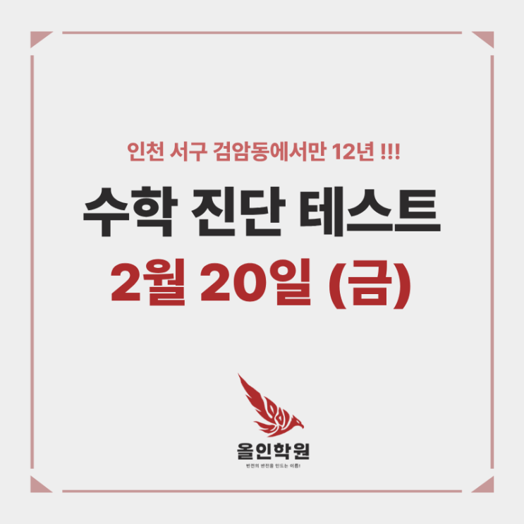 안녕하세요 검암동 올인학원 입니다 3월 새학기를 앞두고 올인학원에서는 중고등 수학 입학테스트를 진행합니다. 이번 테스트는 ✔ 선행 여부 ✔ 개념 이해도 ✔ 계산력·문제 해결력 을 종합적으로 확인하여 내신 준비가 잘 되어 있는지 실력을 점검해드립니다. 입학 테스트 안내 일정 : 2월 20일(금) 시간 : 4시 / 6시 / 8시 (택 1, 50분 진행) 대상 : 중1 ~ 고3 범위 : 1학기 중간고사 범위 중심 결과 : 테스트 결과에 따라 반 배정 진행 학년별 시험 범위 중1 : 소인수분해 ~ 정수와 유리수 중2 : 유리수와 소수 ~ 다항식의 계산 중3 : 실수와 그 계산 ~ 인수분해 고1 : 다항식의 연산 ~ 이차방정식·이차함수 고2 : 지수 ~ 삼각함수....... <img src="https://blogthumb.pstatic.net/MjAyNjAyMDlfMjU3/MDAxNzcwNjQzNDk4ODU0.hwlcV3fhfiDtrrU6IUwlRXQ9lSyKI7GpwsrrzVAQbSAg.8_Pu7JQjwa_mC7sOtA5NdUrg_WM500vkVNdWPrTgTnAg.PNG/%BA%ED%B7%CE%B1%D7_%C7%A5%C1%F61.png?type=s3" />
