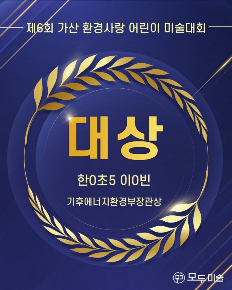 안녕하세요, 모두미술입니다. 지난 보건복지부 장관상 소식에 이어, 이번에는 제6회 가산 환경사랑 어린이 미술대회에서 우리 모두미술 친구들이 좋은 성과를 거두었습니다. 전국 어린이가 참여한 대규모 공모전에서 무려 대상(환경부 장관상)을 포함해 총 8명이 수상의 영예를 안았습니다.✨✨ 수상내역 대상 (기후에너지환경부 장관상) 1명 장려상 (광동제약대표이사상) 2명 입선 (한국건강증진개발원장상) 5명 ✔️ 왜 모두미술은 장관상에 강할까요? 환경이라는 주제는 자칫 뻔한 그림이 나오기 쉽습니다. 하지만 모두미술은 다릅니다. 아이와 함께 기후 위기와 에너지에 대해 깊이 대화하고, 아이만의 독창적인 해법을....... <img src="https://blogthumb.pstatic.net/MjAyNjAyMTBfMjUw/MDAxNzcwNzA1NDU4Mjk3.nu2yGOO4ZssDTKW8dSQ3D7LPzKg8dXPynnxdybYMrd4g.ZbYgFsv48kRNtLJVvGTlK0fSAD00sgvLcYqk3M0fXvQg.JPEG/IMG%A3%DF2237.JPG?type=s3" />