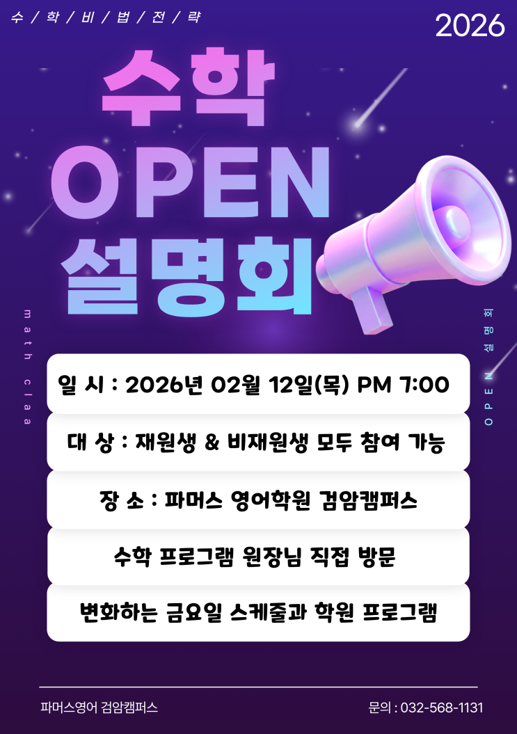 안녕하세요 학부모님 파머스 영어 검암 캠퍼스입니다. 학부모님들께 반가운 소식을 전해드립니다. 그동안 많은 학부모님께서 문의 주셨던 수학 수업이 곧 오픈될 예정이며, 이를 앞두고 수학 수업 오픈 설명회를 진행하고자 합니다 ⏰ 일시 : 2026년 2월 12일(목) 오후 7시 대상 : 수학 수업에 관심이 있는 모든 재원생 & 비재원생 학부모님들 (※ 네이버 플레이스를 통해 미리 예약해 주세요.) 장소 : 파머스 영어 검암캠퍼스 ☎ 문의 : 032-568-1131 아이마다 공부를 받아들이는 방식은 모두 다릅니다. 같은 수업, 같은 설명을 들어도 결과가 다른 이유는 단순히 능력의 문제가 아니라 학습 성향의 차이에서 비....... <img src="https://blogthumb.pstatic.net/MjAyNjAyMDNfMjg0/MDAxNzcwMTAzMTI4NDc4.uE0FR9EP-PB9CJKQ0QFoVOExoGmHPId3n0v2JAfbQssg.xHMJvM9qGIXE9V379mO73_xcWNXZ3ncP5eVrWcF5CH4g.PNG/%BC%F6%C7%D0_%BC%B3%B8%ED%C8%B8.png?type=s3" />