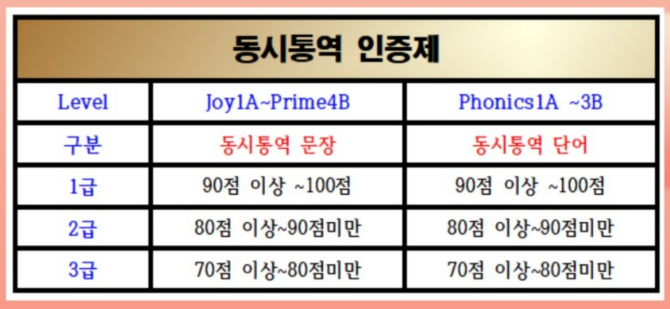 2026년 잉글리시아이 포트폴리오 콘서트 결과가 발표되었네요♬♬ 올해는 결과가 늦게 나왔어요~~ https://youtu.be/TAGyBkqdXkU?si=BEyXZDPk8L9D16G3 본부상을 수상한 명♥아 넘넘 축하해♥♥ 제2회 동시통역 인증제 결과예요^^ 1년에 1회씩 열리는 초등인증제인 만큼 우리 아이들의 인증레벨이 작년에 비해 많이 높아졌습니다. Ι 동시통역 인증제 기준:) ★ 동시통역 인증제 결과 ★ 동시통역 인증에 통과한 친구들은 인증서가 수여수었습니다^∪^ 1급 (Prime, Pride, Wise, Phonics) 2급 (Pride, Joy, Phonics) 3급 (Pride, Wise, Joy) 열심히 해준 우리 초등 친구들 고마워^^ 급수를 받지 못한 친구들은 더욱 열심히 해서 내년에는 1급....... <img src="https://blogthumb.pstatic.net/MjAyNjAyMjJfMjc3/MDAxNzcxNzU3Njk1MjYw.CqwDhgIGynBMuiuqysXQuAvNxf3rHarDnzsseRUdKHEg.hmi1A0VAwSyAtmPMxPmtzLMk3Efik-zssktxX6_n2rUg.PNG/20260222_195434.png?type=s3" />