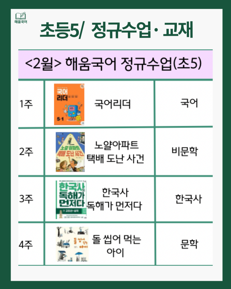 안녕하세요 해움국어교습소 입니다 해움국어 초등5,6학년 2026년 2월 정규수업 교재를 안내드리겠습니다 !!! 저희 해움국어교습소에서는 단기간 점수 올리기보다 아이의 읽는 힘을 키우는 수업을 합니다. 아이가 글을 읽고 ✔ 이해했는지 ✔ 스스로 설명할 수 있는지 ✔ 글로 정리할 수 있는지를 중심으로 지도합니다. 초5·6은 국어 실력을 만들어가는 가장 중요한 시기이기 때문입니다. 초등 고학년 국어는 ‘지금 잘하느냐’보다 ‘중학교에서 무너지지 않느냐’가 더 중요합니다. 우리아이의 국어, 지금 한 번 제대로 점검해 보셔도 늦지 않습니다. << 초등5학년 2026년 2월 정규수업 교재 >> 국어 / 비문학 / 문학 / 한국사....... <img src="https://blogthumb.pstatic.net/MjAyNjAxMjhfMjE2/MDAxNzY5NjA2NzU3MTg2.ZaNCnb9QzlqmxPg7aHnx91AU8j6S5aF4eGrDXk0pz5gg.eWx8dFuyhd_xm5k15YCf-qRKEaSZdIYjHutU0pWeRUkg.PNG/3.png?type=s3" />