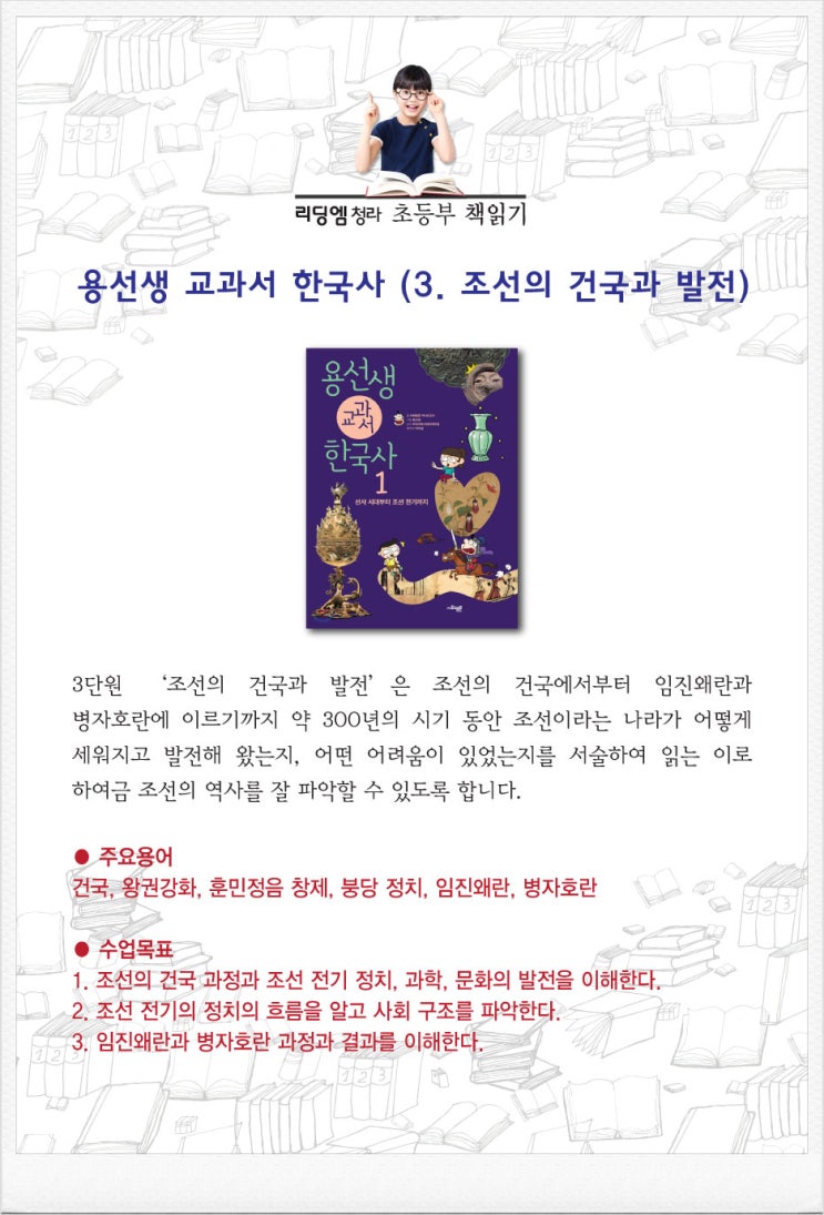 인천서구청라 초등독서논술학원 리딩엠인천청라 초등부 5학년 수업 '용선생 교과서 한국사1(3.조선의 건국과 발전) ' <img src="https://blogthumb.pstatic.net/MjAyNjAyMDdfMzYg/MDAxNzcwNDM1MTI4Njgx.0Z4pDc1th3UoUpQfixEG-FHGJc7U19C8wMT7WiunHQog.xA1Q3K09JiYTRVo9_54-fMjJ_3giqvkdg9X9TRuIDPEg.JPEG/%C3%CA5-%BF%EB%BC%B1%BB%FD-%B1%B3%B0%FA%BC%AD-%C7%D1%B1%B9%BB%E7-%283.-%C1%B6%BC%B1%C0%C7-%B0%C7%B1%B9%B0%FA-%B9%DF%C0%FC-2025.jpg?type=s3" />