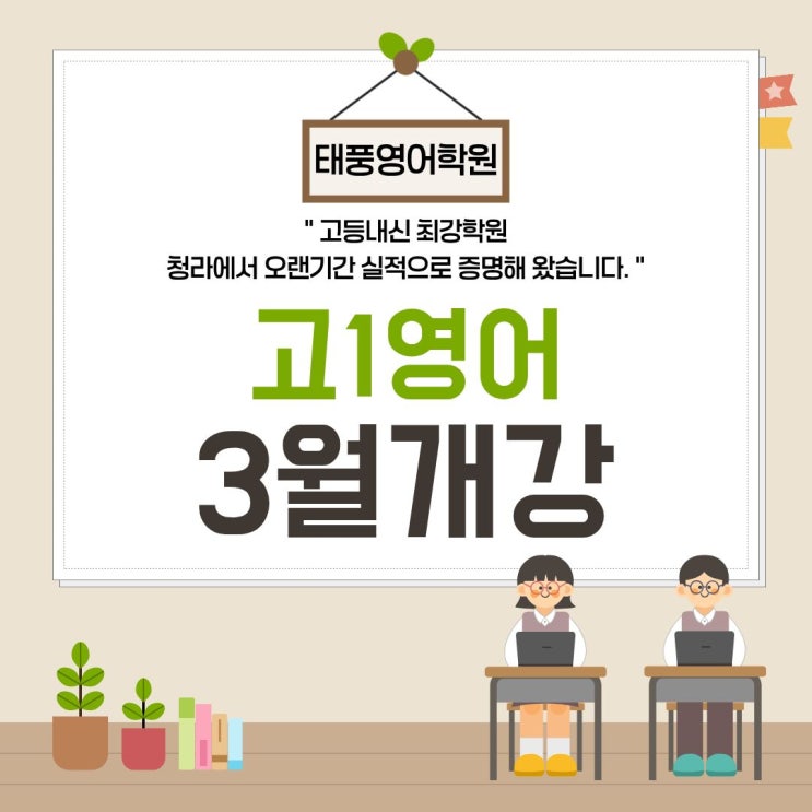 고등영어 내신에서 오랫동안 좋은 실적을 만들어왔던 태풍영어학원에서 고1(예비) 영어반을 학교별로 개강합니다. 청라고반 월수금 5시~7시 해원고반 화목 7시~9시, 토 11시~1시 초은고반 월수금 5시~7시 신현고반 월수금 9시~11시 대인고반 월수금 7시~9시 서인천고반 월수금 9시~11시 오랜기간(청라에서 영어만 9년차) 지역 고등학교들의 내신을 준비해온 노하우로, 학교별 예상문제와 다양한 모의고사 변형문제를 포함한 최적의 교재들을 학교별로 제작하여 완벽한 내신대비를 하도록 하겠습니다. 3월3일부터 요일별 개강합니다. <img src="https://blogthumb.pstatic.net/MjAyNjAyMDlfODMg/MDAxNzcwNjM0NzcxNTE5.HYi_mI_wwnMahoLNbwqg0mp_fCL8g2KjEOVJ0xmg5sQg.AD4fQcgGQNagODOBzJxuTs2LLwGUvX-1vTyESjaaFhwg.JPEG/%B0%ED1%BF%B5%BE%EE%BA%ED%B7%CE%B1%D7.jpg?type=s3" />