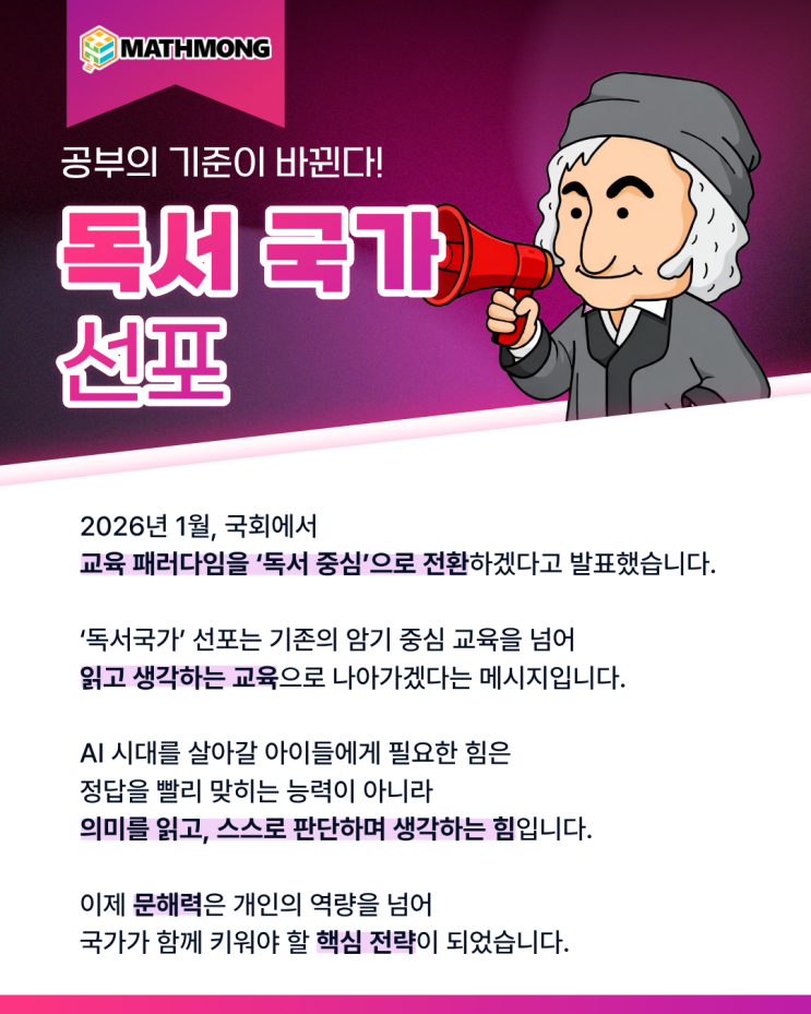 [매쓰몽 청라센터] AI 시대, 읽는 힘이 수학 실력이 됩니다 "독서가 국가 경쟁력이다!" 대한민국 독서국가 성포에 발맞춘 매쓰몽 청라센터의 사고력·독해 기반 수학 교육 지난 1월 23일 대한민국은 국회에서 '독서국가' 선포식 및 추진위원회 출범식을 공식 개최하며, 독서를 AI 시대 핵심 교육 전략으로 국가 차원에서 강화하기로 선언했습니다. 이 선언은 단순한 독서 장려를 넘어 책을 읽고 생각·이해·표현하는 능력 ⇒ 국가 경쟁력으로 보는 새로운 교육 패러다임 전환을 의미합니다. 매쓰몽 청라센터도 같은 방향을 지향합니다! ✔ 동화 기반 개념 이해 + 탐구 노트 학습 → 읽기·이해력을 수학 개념으....... <img src="https://blogthumb.pstatic.net/MjAyNjAyMDlfMTEg/MDAxNzcwNjE0OTg0MjQx.rdMjMWTVpIvjoSuS6VVWZnwt1CQ_-iO3GjtqrJFKueEg.svAK269c9uu0ephKsuVTE_nDfBo4DT5yWbEvkMGgzr4g.PNG/1%B5%B6%BC%AD%B1%B9%B0%A1%BC%B1%C6%F7.png?type=s3" />