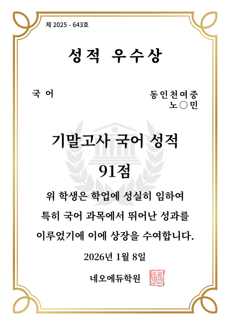 [가좌동 국어학원] 동인천여중 성적 우수자 시상 <국어>