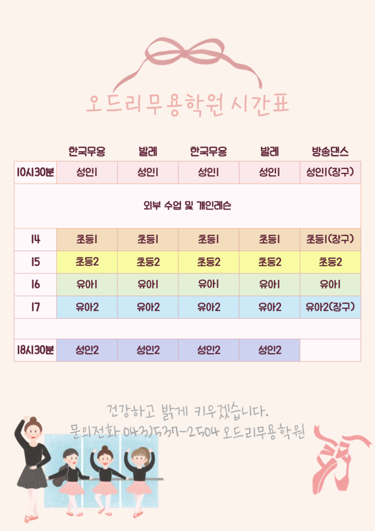 26년 3월붙터 새로워진 오드리 무용학원 시간표 입니다 <img src="https://blogthumb.pstatic.net/MjAyNjAyMjRfMTY3/MDAxNzcxOTE3NTMzMDg5.j4UiPX6uBvTfXB2mdMVZgj7B1CXjaR3sHhIedAum5Wwg.TrknYmDBWmqjv2_Mqs6mB-eEJCERfLxuYwUHbS0iZ5Eg.PNG/%BD%C3%B0%A3%C7%A5.png?type=s3" />