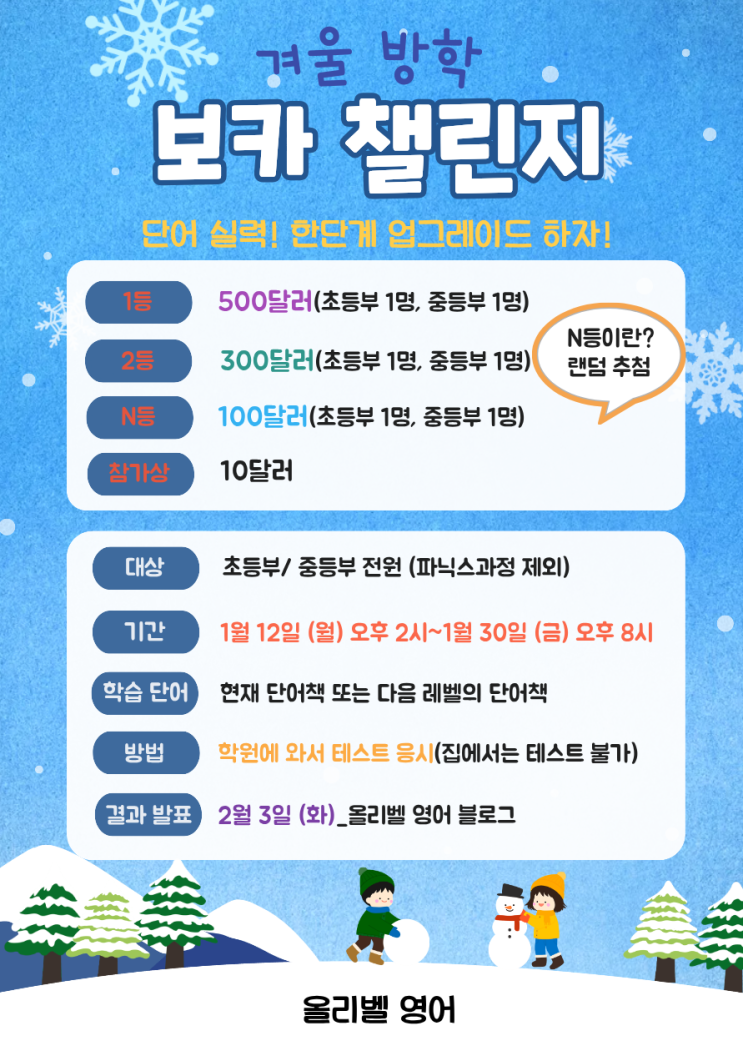 단어는 영어 실력의 기초 체력입니다. 독해도, 문법도, 서술형도 결국 “단어를 얼마나 정확히 아느냐”에서 갈립니다. 특히 요즘 시험은 표현이 더 까다로워져서, 단어가 흔들리면 실력이 있어도 점수가 무너질 수 있어요. 그래서 올리벨 영어는 겨울방학을 “쉬는 시간”이 아니라 “업그레이드 시간”으로 씁니다. 방학 동안 리듬이 흐트러지지 않도록, 아이들이 스스로 목표를 잡고 끝까지 달릴 수 있게 준비한 것이 보카 챌린지입니다. 평소 하던 단어를 더 탄탄히 다지거나, 다음 레벨로 한 단계 올라가는 도전도 가능합니다. 게임처럼 재미있게 참여하되, 결과는 실력으로 남게 하는 것이 이번 이벤트의 목적입니다. 아이들이 “방학에 단....... <img src="https://blogthumb.pstatic.net/MjAyNjAxMDhfMzgg/MDAxNzY3ODU0MzE0OTg3.ZtZj0lAz0Phar4uDLmJ0uuGWWN8F-FEgU9Yn_t9MlEog.gMiLPE5UaUmKEG7Loprz8uUGvJFiuIAXFgZGcL8jsg4g.PNG/%BA%B8%C4%AB%C3%A7%B8%B0%C1%F6.png?type=s3" />