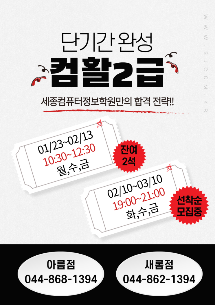 안녕하세요~ 세종시 컴활 전문 교육기관 세종컴퓨터정보학원입니다^^ 디지털 전환 시대, 이제 엑셀(Excel) 능력은 선택이 아닌 필수인 시대입니다. 컴퓨터활용능력 2급은 2026년에도 여전히 가장 공신력 있는 자격증 중 하나로 꼽히고 있습니다. 세종컴퓨터정보학원만의 체계적인 단기 완성 커리큘럼이 여러분의 진로와 실무 능력을 어떻게 바꿔놓을수 있는지 경험해 보세요~~ 컴활 2급은 대학 입시나 특성화고 진학시 귀중한 가산점 항목이 될 수 있습니다. IT활용 능력을 증명하는 객관적인 지표가 되며, 일부 대학에서는 자격증 취득 시 교양 학점으로 인정되기도 합니다. 취업 시장에서 '엑셀 가능자'라는 문구는 매우 흔합니다. 하....... <img src="https://blogthumb.pstatic.net/MjAyNjAxMTlfMTkx/MDAxNzY4Nzg5NjU0MjM4.0V8TCqm6MW0ihX35AGTNayA3l1-kT-RFpNsWW2gEev4g.pOJSBbfqjOZdoDWsJsxaHKdjtp2o4Xy-PmohdqtZpTAg.PNG/%C4%C4%C8%B02%B1%DE-001_%2862%29.png?type=s3" />