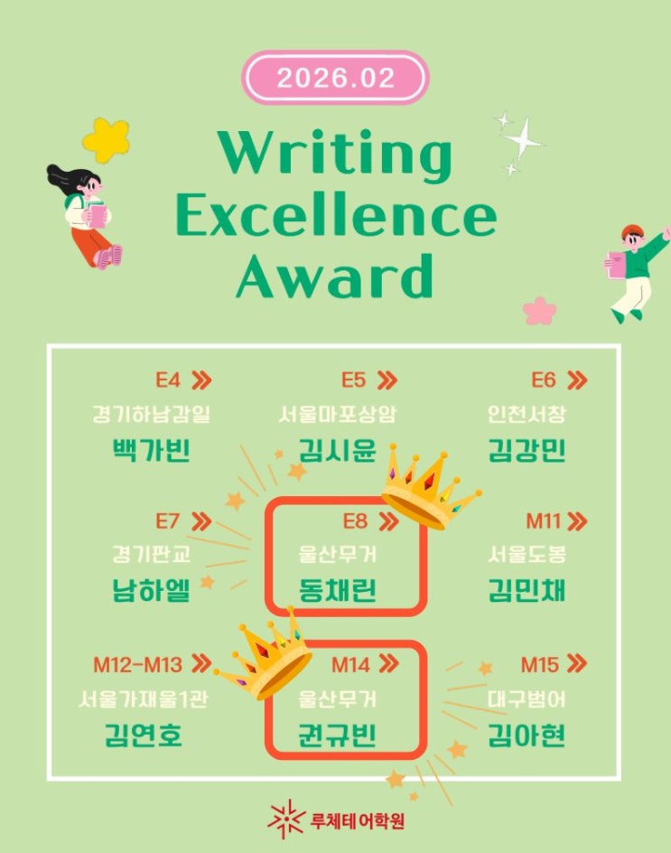 안녕하세요, 루체테어학원 무거캠퍼스입니다 오늘은 아주 특별한 소식을 전해드리려 해요! 2026년 2월, 전국 루체테 Writing Excellence Award에서 무거캠퍼스에서 무려 2명의 학생이 우수자로 선정되었습니다! 초등영어 E8 동채린 – 2회 연속 수상의 주인공! 지난 12월 수상에 이어, 이번에도 동채린 학생이 당당히 이름을 올렸습니다. Writing 수업 Unit 3에서 [Sports are important in my life]라는 주제로, 아이답고도 진지한 시선을 담은 글을 완성했어요. “Playing a sport helps me make friends and learn new skills.” “I feel happier and relaxed after playing dodgeball or soccer.” 동채린 학생의 글....... <img src="https://blogthumb.pstatic.net/MjAyNjAyMDlfMTg5/MDAxNzcwNjA2MDI5NzU3.UpD04v3CBbccWRzVVRLIGSiY7Ri-RkbddWFcfK8LvBkg.3wPmOyyPyuHiT3itcvtLSbteXcGuvoTI4VA3nxLheXcg.JPEG/%C1%A6%B8%F1%C0%BB_%C0%D4%B7%C2%C7%D8%C1%D6%BC%BC%BF%E4._%283%29.jpg?type=s3" />
