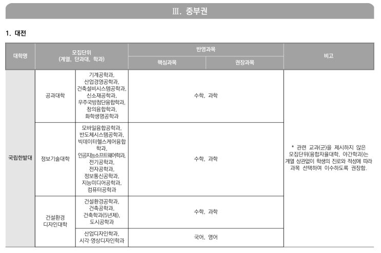 *본 자료는 대학별 2028학년도 모집단위별 반영 과목 발표 자료를 요약 정리한 자료 ('2025.9.30 대입정보포털 어디가' 기준) *추후 대학 발표에 따라 내용이 수정될 수 있습니다. 반드시 해당 대학의 모집요강을 확인하시기 바랍니다. #2028학년도 #대학별 권장과목 #중부권 - 대전 <*출처 : 대입정보포털 https://www.adiga.kr> <img src="https://blogthumb.pstatic.net/MjAyNjAyMDhfNjcg/MDAxNzcwNTI0MTE4NTky.eqq9gMBdtf4j_PFaJkbY_MvSacP1qqNgFQ1mOU8Fd7Mg.g0IgzsnoVA5vn5YYPt2LsCJ_QY9diJIACB5E4lZCkT8g.JPEG/2028_%B8%F0%C1%FD%B4%DC%C0%A7%BA%B0_%B9%DD%BF%B5%B0%FA%B8%F1_%B9%D7_%B4%EB%C7%D0%BA%B0_%B1%C7%C0%E5%B0%FA%B8%F1_%C0%DA%B7%E1%C1%FD_84.jpg?type=s3" />
