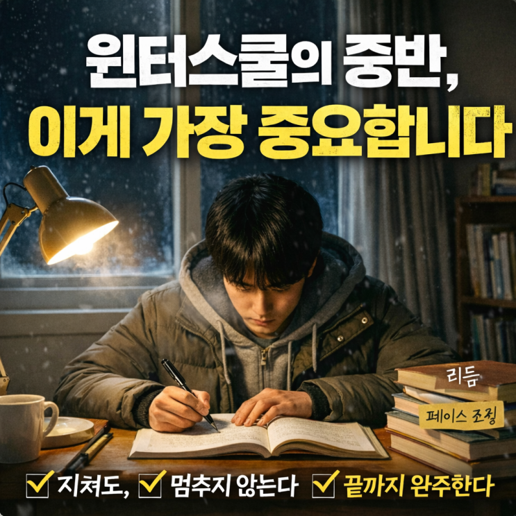 오전 9시 등원, 밤 10시 하원. 어느덧 윈터스쿨의 절반이 지났습니다. 요즘 들어 아이들의 어깨가 조금 무거워 보이지 않으신가요? 매일 똑같이 반복되는 일정을 소화하며, 포기하고 싶은 마음을 꾹꾹 눌러 담아온 시간이 꽤 쌓였을겁니다. 그러니 지금 아이들이 느끼는 피로는 너무나 당연한 현상입니다. "하기 싫은 게 아니라, 조금 버거운 겁니다" 이때 아이들의 표정은 "공부하기 싫어"가 아닙니다. "조금 버거워"에 가깝습니다. 이건 의지가 약해졌다는 신호가 결코 아닙니다. 지금까지 도망치지 않고 치열하게 잘 버텨왔다는 가장 확실한 증거입니다. 실제로, 어제 하원 전 숙제 검사 시간에 있었....... <img src="https://blogthumb.pstatic.net/MjAyNjAyMDhfNzEg/MDAxNzcwNTQ0NDg2NzUx.Y02BsWikqVzPX94fE1GxgyZDuJetOR0cfxhRWBTUbYkg.YeeldpxHoP1DAs0PjH4rJphPUPJRyn0bVWj1vOtCOyMg.PNG/ChatGPT_Image_2026%B3%E2_2%BF%F9_8%C0%CF_%BF%C0%C8%C4_06_54_07.png?type=s3" />