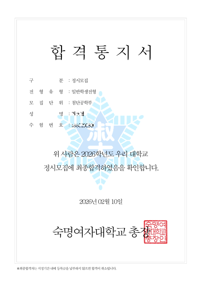 2026학년도 숙명여자대학교 첨단공학부 정시 최종 합격 2026학년도 숙명여자대학교 첨단공학부 정시모집에서 높은 경쟁 속에서도 최종 합격이라는 뜻깊은 성과를 이루었습니다. 2025학년도(최근 공개 기준) 숙명여자대학교 정시 전체 경쟁률은 약 4.5:1 수준로 나타났으며, 여대 상위권 대학임에도 정시 경쟁이 치열했습니다. 숙명여대는 2025학년도 정시 나군 일반학생전형에서 약학부·첨단공학부·자유전공학부 등을 포함해 452명을 수능 100%로 선발했습니다. 첨단공학부는 인공지능공학부, 지능형전자시스템전공, 신소재물리전공, 컴퓨터과학전공, 데이터사이언스전공 등 첨단 분야 5개 전공으로 구성된 미래 공학 융합 학부로 신설된 모집단....... <img src="https://blogthumb.pstatic.net/MjAyNjAyMTJfMTEy/MDAxNzcwODcxOTE5MTU3.Q8z3sKS4dVrZlcW--eDvQFPYnKGY43-4UW-PH8T_WcYg.nTiM1BcZ1NbAeJnP6UR5TM8o7d0w9p2aNsFrs42bPM0g.PNG/%BC%F7%B8%ED%BF%A9%B4%EB_%C6%E8%C5%E4_%B1%C7%C7%F6%BF%B5.png?type=s3" />