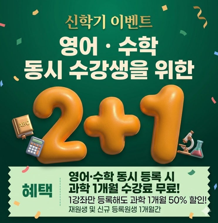 이매동 수학과학영어학원 코코스학원 신학기 2+1 특별 이벤트 안내 신학기의 새로운 과제: 넓어진 학습 범위와 과학 과목에 대한 막막함 초등학교 고학년에서 중학교로 올라가는 시기에는 학습 범위가 크게 넓어지고 낯선 용어들이 등장하여 많은 학생들이 어려움을 겪습니다. 과거에 영어와 수학의 기초를 다지는 데 집중하던 한 학생이 새 학기를 맞아 갑자기 수준이 높아진 과학 과목을 접하고 학습 방향을 잡지 못해 막막해했던 상황이 있었습니다. 늘어난 학업량 속에서 세 과목의 학습 균형을 유지하는 것은 어린 학생들에게 상당한 부담이 될 수 있습니다. 코코스학원은 이러한 학생들과 학부모님들의 현실적인 고민을 덜어주고자 새로운....... <img src="https://blogthumb.pstatic.net/MjAyNjAzMDVfMTE5/MDAxNzcyNjc0NDEyNDIz.WXDnmUy_4l-F8t2JIF4ETBR3KGUyaMhH2rsckGaRqWIg.8th_30gD5p5za6gEZqiCSNedHFlzySA1K3iRU9sx9jUg.JPEG/unnamed.jpg?type=s3" />
