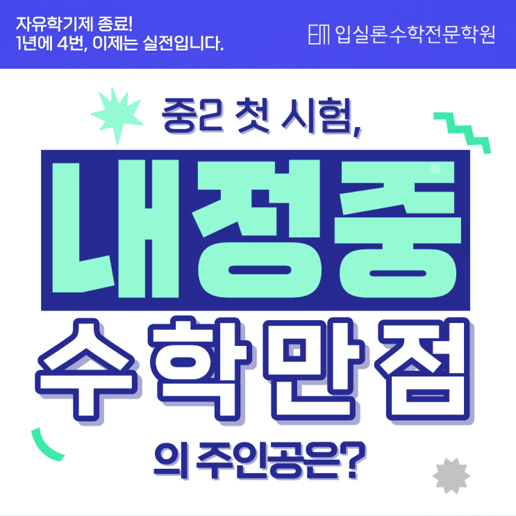 1년에 4번, 진짜 시험이 시작된다! 안녕하세요. 언제나 정성을 담아 지도하는 내정중 수학학원 입실론입니다. 자유학기제가 끝나면 중학교 공부의 분위기는 완전히 달라집니다. 특히 중학교 2학년부터는 본격적인 지필평가 중심의 내신 경쟁이 시작됩니다. 중1 때는 비교적 시험에 대한 부담이 적었다면 이제부터는 1년에 4번의 시험이 곧 성적이 되는 구조이죠... 그래서 많은 학부모님들이 이런 이야기를 하십니다. 이제는 1년 내내 시험 공부만 하는 느낌이에요. 실제로 중2부터는 수행평가 + 지필평가가 함께 반영되면서 학생들이 느끼는 압박감도 훨씬 커집니다. 자유학기제 종료! 이제는 진짜 시험이 시작되는 시기입니다. 1년 4번의 지필....... <img src="https://blogthumb.pstatic.net/MjAyNjAzMDVfMTMx/MDAxNzcyNzA1NTUxNDg5.Qk7Jcn-hdoSEPsGsDyUQIU5EtR40QuQxQAEWPpslYE4g.0Biky8wZjZvFo2jHcKue2QEQ_1J21zDAhCHKWY4C434g.PNG/1.png?type=s3" />