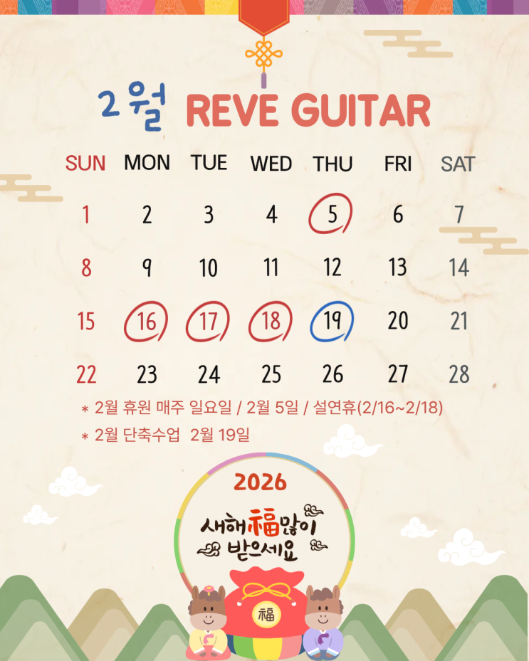 레브기타음악교습소 1월 수업 스케줄 안내 안녕하세요, 레브기타음악교습소입니다 2월 수업 일정을 안내드립니다. ✅ 정기 휴일 안내 매주 일요일 정기 휴무 ❄️ 설연휴 2월 16일(월) - 2월 18일(수) ✅ 2월 임시휴원 및 단축운영 안내 2월 5일(목) 임시휴원 2월 19일(목) 저녁 7시까지 단축운영 -학원 기자재 점검 및 수리, 세미나 참석등으로 안내해드린 일정은 휴원, 단축운영 합니다. 휴원시 수업, 상담등의 학원 업무가 중단되며 연습실 사용도 중단됩니다. (단축운영일에는 단축운영시간만큼 연습실 사용가능합니다) 출결등의 문의사항등은 학원 카톡으로 남겨주세요 즐겁고 건강한 설연휴 보내시고 더욱더 행복한 올 한해 되시....... <img src="https://blogthumb.pstatic.net/MjAyNjAyMDJfMjI2/MDAxNzcwMDAxODUyMTMz.Vian2YdFZq5gyQfO68WX74rSG6ewitdmlhVS0T3jvLog.Cy04DGCr6_f4m5-H6QQG-ZKEr2Pzkl1o-5G76TkTiPEg.PNG/KakaoTalk_Photo_2026-02-02-12-06-38.png?type=s3" />