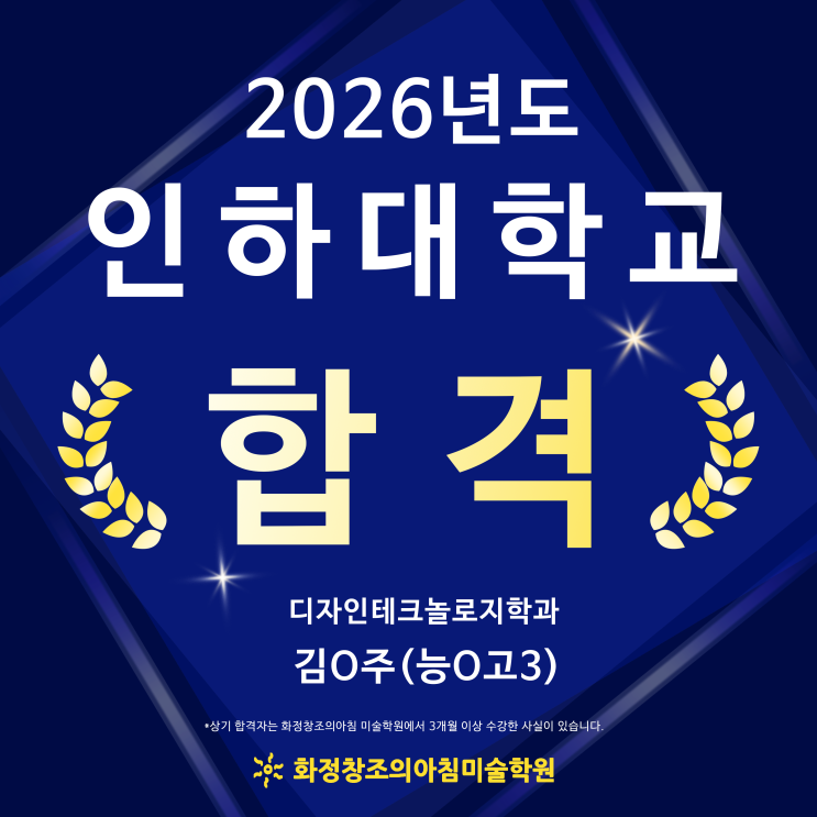 인하대 합격한 김0주 학생 합격을 진심으로 축하합니다! 화정 창조의아침 미술학원 - 디자인 전문반 디자인 입시, 실력으로 증명합니다! 창조의아침 미술학원 디자인입시전문반 학생들의 작품 퀄리티가 한층 더 높아졌습니다. 세밀한 개체 묘사, 감각적인 공간 구성, 그리고 창의적인 표현력까지! 꾸준한 연습과 노력으로 완성된 학생들의 결과물이 입시 경쟁력을 증명합니다. 더 정교해진 표현력 – 정확한 형태와 깊이 있는 명암 완성도 높은 공간 구성 – 창의적인 시각과 안정적인 구도 실전 감각을 살린 연습 – 대학교 실기대회 및 입시 대비 김유진 강사님의 지도 아래, 학생들은 꾸준한 성장과 발전을 이어가고 있습니다....... <img src="https://blogthumb.pstatic.net/MjAyNjAyMDRfMjY2/MDAxNzcwMTg0NjM3NDMw.u93Ma7rxYXTCcHE3axGMWfTGKZtx0_YWnbPp9asGlr4g.RIH1AYUdU8Ahwb084MQETMBG7Fb3mMtzK9FtpYSiiLIg.PNG/2026%C0%CE%C7%CF%B4%EB_%B1%E8%B9%CE%C1%D6.png?type=s3" />