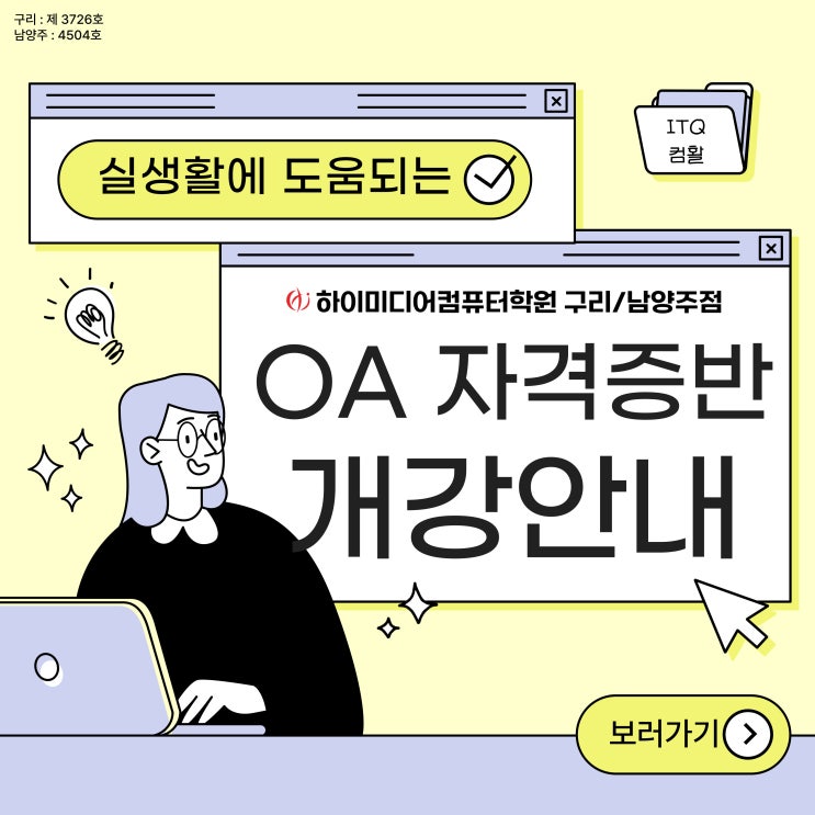 별내, 갈매, 다산, 구리, 덕소, 마석, 평내, 호평(동) 컴활 자격증 / ITQ(한글, 엑셀, 파워포인트) 컴퓨터 실무 배울 수 있는 학원 안내