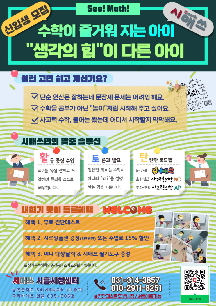 안녕하세요 시매쓰 시흥시청센터입니다. 학부모님 가정에 건강과 행운이 가득하시기 바랍니다! 아래와 같이 새학기 신입생 모집을 하고 있으니, 우리 아이들의 수학학원에 대해 고민중이셨던 분들은 문의 주시기 바랍니다. 감사합니다 :) 진단테스트 네이버예약 (아래 링크 클릭) 시매쓰 시흥시청센터 (031-314-3857) <img src="https://blogthumb.pstatic.net/MjAyNjAxMTNfODQg/MDAxNzY4Mjc1OTM4NDAx.7axIoZOFOAhFWNzqABjX4fO8XqmcCl2AHapqdSjMMP0g.Po22Icsgmt014b-KNilZ1Qzohm33Z67sYOFV5QBh7Twg.PNG/20260102_%BF%F8%BB%FD%B8%F0%C1%FD.png?type=s3" />