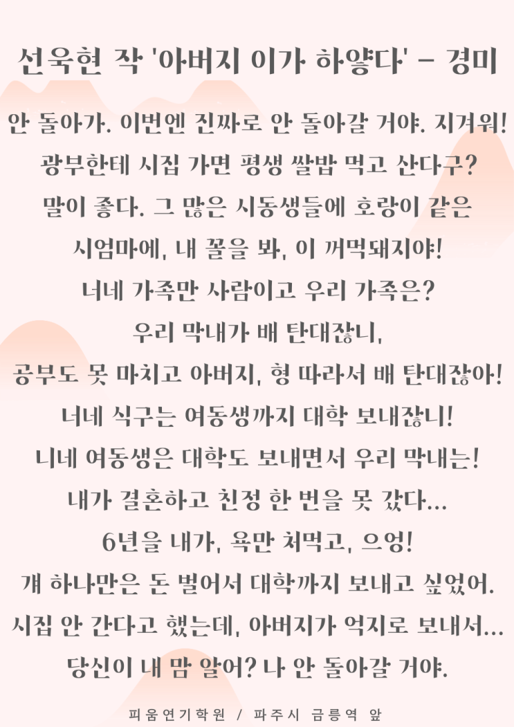 [파주연기학원] 선욱현 작 '아버지 이가 하얗다' - 경미, 정자의 독백 / 강원도 탄광 배경 연극