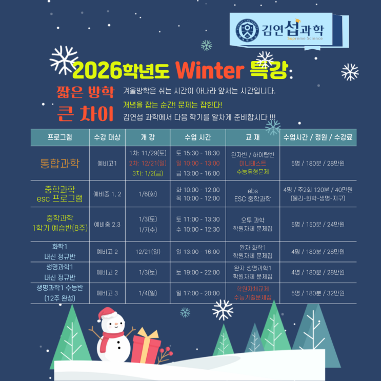 2025-2026 시즌 김연섭 과학 겨울방학 특강 시간표 동탄솔빛로 52 나루상가 금탑프라자 504호 김연섭과학 / 010-2334-6202 1. 통합과학 수업 안내 중학교 과학과 고등 통합과학은 다릅니다. 고1 과학은 암기가 아니라 개념 연결과 사고력이 성적을 만듭니다. 겨울방학은 그 차이를 미리 메울 수 있는 유일한 준비 기간입니다. ① 12주|고1 통합과학 전과정 완성반 “처음부터 끝까지, 제대로 한 번” 고1 통합과학 전 범위 체계적 정리 개념 이해 → 자료 해석 → 문제 적용 고1 내신의 기본 체력 완성 통합과학을 처음 제대로 배우고 싶은 학생 ② 8주|킬러단원 집중 심화반 “어려운 단원만 골라서, 깊게” 고1 통합과학 고난도·변별력....... <img src="https://blogthumb.pstatic.net/MjAyNTEyMTRfMjEx/MDAxNzY1NzE4OTYxNTM5.4EPMTeMfk9Uy3KXjjK4g034LPHzm6_T-Qdqh0bEHZiog.M_9-annbPHJNvUH5vIekpvirVewJa_F31BJ-Ttt4gVUg.PNG/2024_2025%BD%C3%C1%F0-%B0%DC%BF%EF%B9%E6%C7%D0-%B0%AD%C1%C2-001_%281%29.png?type=s3" />