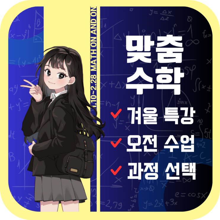 안녕하세요 매쓰온앤온입니다. 오늘은 2026 겨울방학 맞춤수학을 소개하겠습니다. 맞춤 수학 기간 2026.1.10 ~ 2.28 요일 & 시간 월수금 am10:00 ~ pm1:00 (정원 초과시 화목토 추가 개강) 대상 겨울방학을 통해 과정을 완성하기 위한 학생 현행과는 별개로 선행 과정 수강을 희망하는 학생 심화 과정 및 킬러문제 풀이를 다지고싶은 학생 ...등 목표를 달성하고 싶은 학생 목적 허투루 보낼 수 있는 겨울방학 오전시간을 학습으로 채우며 새학년이 시작될 때, 전학년과는 다른 보다 높은 위치에서 학습을 시작할 수 있도록 하는 것 수업방식 학부모님, 학생과의 상담을 통해 수업 과정을 선정 과정에 맞는 개별수업 진행 (정원 5명 선착순) ....... <img src="https://blogthumb.pstatic.net/MjAyNTEyMjhfMTUw/MDAxNzY2OTAwOTgzMTUz.tmgM8YBtTrP7EjSwPjq74Qx12nOkbp2CR5uvWhewxoEg.wavrzdJYQX_Q3u8wVJ7AAffC_tCxLxCBsIE31zduD54g.PNG/%B0%DC%BF%EF_%B8%C2%C3%E3%BC%F6%C7%D0.png?type=s3" />