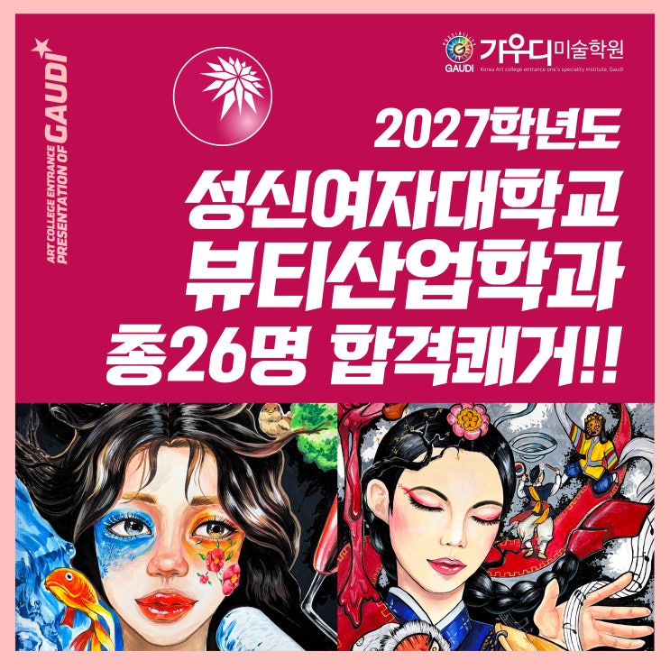 2027학년도 성신여자대학교 뷰티산업학과 모집요강! 안녕하세요 성북 가우디미술학원입니다. 오늘은 성신여대 뷰티산업학과에 관한 글을 쓰겠습니다. 최근에는 K-뷰티가 인기가 있으면서 뷰티산업에 관심이 많아지고 있습니다. 2026 동0고3 권0율 합격을 진심으로 축하합니다!! 성신여자대학교 뷰티산업학과는 화장품,메이크업을 넘어 기초적인 뷰티 소양과 화장품제조,마케팅, 바이페인팅, 트렌드 등 뷰티의 인재를 길러내고 양성하는 학과입니다. 성신여대 뷰티산업학과 미대입시 수시모집 실기/실적으로만 17명을 선발하고 반영비율은 실기 55% + 학생부 45%입니다 정시모집은 하지 않습니다!! 실기는 소묘와 뷰티 일러스트레이션으로 진행하....... <img src="https://blogthumb.pstatic.net/MjAyNjAyMTFfMjQ4/MDAxNzcwODA1MTI1OTQ3.D-TMwHTefOxAGfWyrE8BYWu06voT8jAcBXVpRtp13aUg.TV1VHFAGJ4QHHYp1eTl2DODJEmexcKlz_i0mXENTGrIg.JPEG/%BA%E4%C6%BC%BB%EA%BE%F7%C7%D0%B0%FA_%C0%D4%BD%C3%C0%FC%C7%FC-1.jpg?type=s3" />