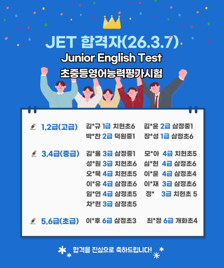 엄마가 먼저 놀란 결과 “붙을 줄 몰랐어요” 겨울방학 무료특강, 그 이후 변화 안녕하세요. 방화역 뮤엠 영어학원 Julie입니다. 이번 겨울방학, 무료특강을 들은 아이들의 JET 시험 결과가 나왔습니다. 그런데 가장 먼저 나온 반응은 아이들이 아니라 어머님들이었습니다. “붙을 줄 몰랐어요…” “분명 떨어졌을 거라고 생각했는데… 그래도 잘 찍었네요 ^^” 첫 시험이라 기대보다 걱정이 컸던 상황. 하지만 결과는 JET 3급 합격. 그런데, 진짜 변화는 그 다음입니다 시험이 끝난 그날, 아이 스스로 말했습니다. “단어 공부 해야겠어.” 그리고 바로 서점에 가서 단어장을 사고, 매일 스스로 공부를 시작했습니다. 누가 시킨 게 아닙니....... <img src="https://blogthumb.pstatic.net/MjAyNjAzMjNfMTI5/MDAxNzc0MjUyOTkxNjI4.Jw5clrZ__RwOb1jrdUVDUvn-_l0INRCodjOy1X1x9cwg.FUwFyawkOBrHlxVB_3oKm--InkFZ_-iBh2rGobUEIScg.JPEG/%C1%A6%B8%F1%C0%BB-%C0%D4%B7%C2%C7%D8%C1%D6%BC%BC%BF%E4_-001_%282%29.jpg?type=s3" />