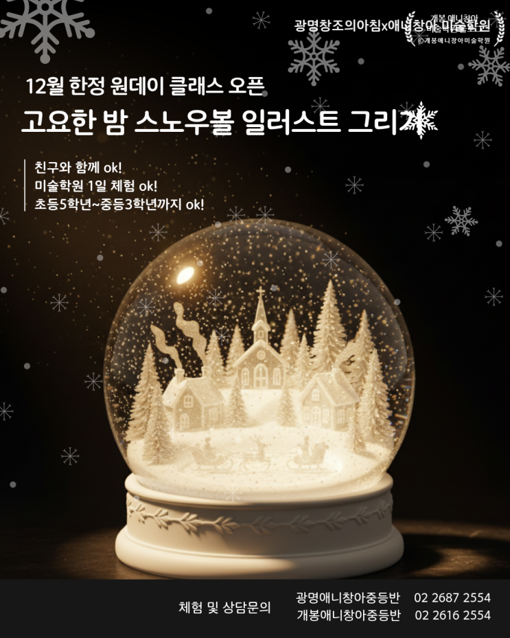 안녕하세요~ 먼저 새해 복 많이 받으세요~!! 다사다난했던 25년을 보내기 전에, 12월 학원에서는 한달동안 친친 이벤트와 원데이 클래스 이벤트를 진행 했답니다~! 내용은 포스터를 참고해주세요~! 보통은 하얀색 도화지에 그림을 그리는데, 이번 그림은 검은색 도화지에 그리는 반전 일러스트라는 것! 검은색 도화지에 처음 그려보는 학생들은 어리둥절~ 샘! 그럼 스케치는 뭐로해요?? 질문이 많았었는데요~ 평소대로 똑같이 하는거야ㅎㅎ 검은색 도화지에 나만의 스노우볼을 디자인하며 힐링의 시간을~ 12월을 보내며 침착하게 올 한해 어땠는지 돌아볼수 있었습니다! 스노우 볼 안에는 겨울 풍경과 더불어 아기자기하게 꾸민 학생들도 있고, 밖....... <img src="https://blogthumb.pstatic.net/MjAyNjAxMTRfMTU4/MDAxNzY4MzYyNTg5NzQ4.RX31wFyQNCJH6EsRiB_qh-UecUlwQqVnq8FMjVbqLIEg.u7lWPSXmYfmarRjmnSjqgpDD_GI-6FHYI2NaybKCN_Ig.PNG/%BD%BA%B3%EB%BF%EC%BA%BC_%C8%AB%BA%B8_%C0%CC%B9%CC%C1%F6.png?type=s3" />