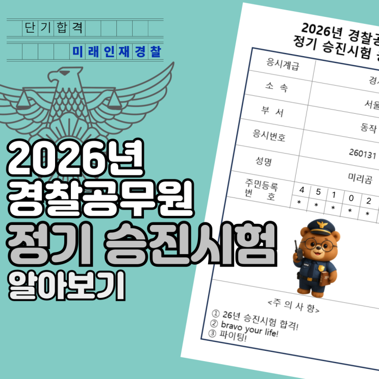 안녕하세요. 미래인재경찰학원입니다 경찰공무원으로 근무하다 보면 채용 이후 자연스럽게 고민하게 되는 다음 단계는 바로 경찰공무원 승진입니다. 특히 2026년 경찰 승진시험을 앞둔 현직 경찰관이라면 막연한 준비가 아닌, 승진 방식·시험 구조·필기 과목·일정을 정확히 이해한 상태에서 계획적으로 준비하는 것이 무엇보다 중요합니다. 이번 글에서는 경찰공무원 승진시험의 종류, 응시 조건, 시험승진 필기 과목, 2026년 경찰 승진시험 일정, 그리고 현직 경찰관들이 가장 많이 묻는 질문까지 한 번에 정리해 드리겠습니다. 01. 경찰공무원 승진 방식 총정리 경찰공무원의 승진은 크게 네 가지 방식으로 구분됩니다. ①....... <img src="https://blogthumb.pstatic.net/MjAyNjAxMTlfMTk5/MDAxNzY4ODEwMTI3ODg0.c2HmrW0Yzoglq9dA3dD4nvsyAz-XS7HMN6MhBLujj0cg.ZJqrMzbYkWnASLpP0qhq7yTe5ZwBDL76yduZ0j2Voqkg.PNG/2026-%C3%A4%BF%EB-%B0%F8%B0%ED_%BA%B9%BB%E7%BA%BB-_1_-001.png?type=s3" />