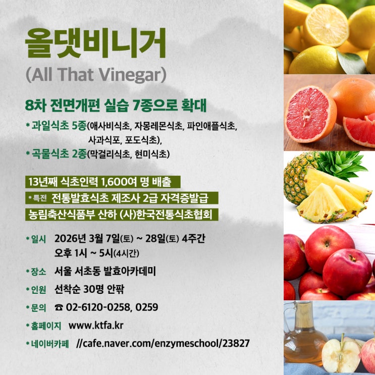 8차 개정 식초학교(2급) 44기 <발효식초 실습 7종으로 확대 개편> 과일식초 5종(애사비식초-자몽레몽식초-파인애플식초-사과식초-포도식초) 곡물식초 2종(막걸리식초-현미식초) *44기 수업 일정 2026년 3월7일(토)-28일(토), 4주간 오후 1시-오후 5시 *44기 수업신청은 네이버폼에서 https://naver.me/x58e6TlX <img src="https://blogthumb.pstatic.net/MjAyNjAyMjBfMjU2/MDAxNzcxNTUzOTE4OTc4.dDKyTBUXX_C9Tbxo_1YBMHU22eEhiM1hmCMFPX93RR4g.nqzCul2m_I_1mCng41DO4EWcedh1edNiHu-UCsJixZgg.JPEG/44%B1%E2%C4%AB%B5%E501.jpg?type=s3" />