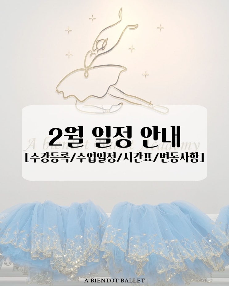 안녕하세요. 목동 발레전문교육기관 아비앙또 발레학원 입니다. 2026년 2월 일정 [수강등록/수업일정/시간표/변동사항]을 다음과 같이 안내해 드립니다. ※ 공지 미확인으로 인해 발생하는 불이익에 대해서는 도움을 드리기 어려운 점 양해 부탁드리며, 아래 공지를 반드시 확인 부탁드립니다. 1. 수강등록 ✨수강등록 일정 재등록 - 1월20일(화) 부터 종강일까지 <2월 재등록 기간> 입니다. - 수강인원 파악 및 개강여부 확인을 위해 재등록 기간을 지켜주시기 바랍니다. - 수강등록 순으로 선착순 정원이 마감됩니다. - 변동사항이 있을 경우 미리 연락주시면 감사하겠습니다. - ★★개강 이후에는 시간변경이 어렵습니다.★★ 신규등록....... <img src="https://blogthumb.pstatic.net/MjAyNjAxMTFfMjI4/MDAxNzY4MTM1MzkwMTcy.5EUYClRkn1tvCjvctzd7FclKjt327DyvgzVWQpLGq1sg.A7kC56qbkd0efyWe0IcQU8XMpyQFuHhKECGYvc4jgQog.JPEG/1.jpg?type=s3" />