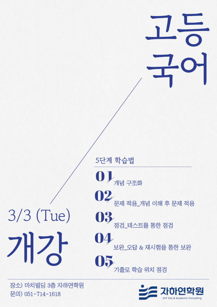 흔들리지 않는 1등급, 자하연 5단계 학습법 안녕하세요, 자하연 학원입니다! 새로운 한 해의 시작을 맞이하여, 1학기 수업을 개강하게 되었습니다. ✨ 고등 국어, 단순히 지문을 읽는다고 점수가 오를까요? 자하연은 막연한 읽기가 아닌, '구조'를 보고 '약점'을 메우는 확실한 시스템으로 승부합니다. ✅ 자하연 국어만의 5단계 밀착 관리 개념 구조화: 머릿속에 국어의 체계를 잡는 수업 문제 적용: 배운 개념을 문제에 바로 녹여내는 훈련 점검: 테스트를 통해 아는 것과 모르는 것을 확실히 구분 보완: 오답 정리와 재시험으로 구멍 난 개념 완벽 보충 위치 점검: 기출 풀이를 통해 내 현재 실력을 객관적으로 파악....... <img src="https://blogthumb.pstatic.net/MjAyNjAyMTFfMTQ5/MDAxNzcwNzk2NDM4MzA2.Nmh700Sl6RQ08sBQhD88-1Dxidj-anm_df4yK-dRBNwg.yRnd0sCcpv-d431iP5QYN0pHWV8TeRa1Ic01H8liq4wg.PNG/%C1%A4%B0%FC_%B1%B9%BE%EE_%B0%B3%B0%AD.png?type=s3" />