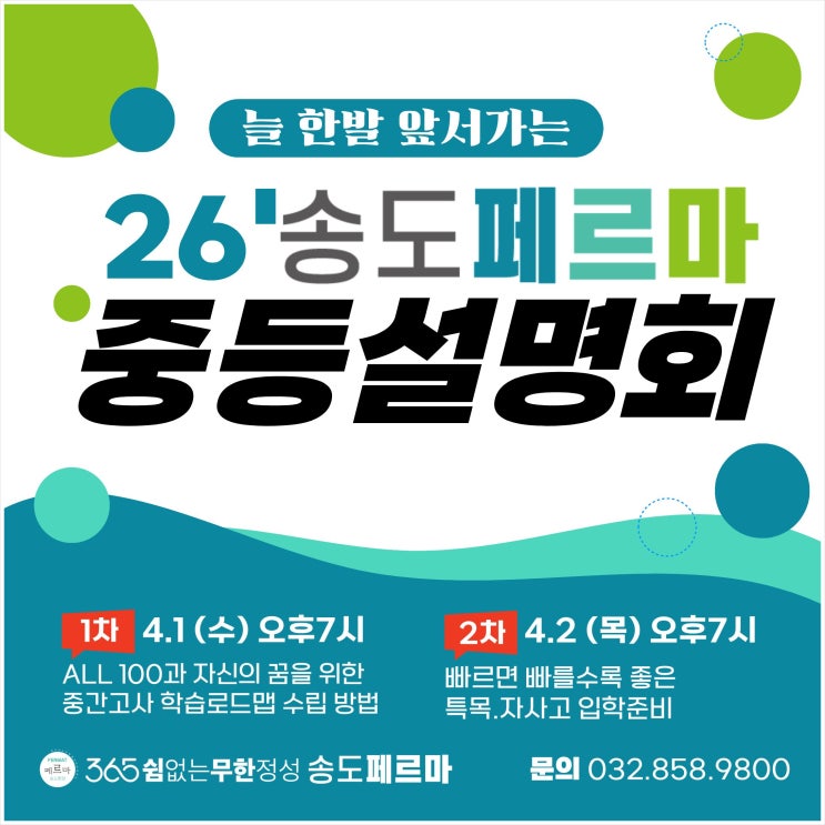 송도와 연수구지역 초등부터 고등까지 수학, 과학, 국어, 영어 멀티플렉스 교육그룹 송도페르마학원입니다. 송도중등수학학원 송도페르마는 오는 4월 초, 모두 두 차례에 걸쳐 지역의 중등 학부모님을 위한 설명회를 준비했습니다. 오랜 시간 송도지역에서 수학·과학과목을 중심으로 특목.자사고 입시전문학원으로 자리 매김하며, 시기마다 꼭 필요한 입시 정보를 전달해드리고자 꾸준히 이어온 자리의 연장선 입니다. 이번 설명회 역시 단순한 정보 전달을 넘어, 실제 진학 결과와 변화하는 입시 흐름을 함께 짚어보는 시간으로 구성하였습니다. 이틀 연속 이어지는 설명회의 첫번째 순서는 4월 1일 수요일 저녁 7시에 개최됩니다. 첫날 설명회....... <img src="https://blogthumb.pstatic.net/MjAyNjAzMThfMjQy/MDAxNzczODM1ODg0NjYy.4b9i6qM6fYH-QRSuod6Kgy6W0MQmmtzhMRsCemQHvN4g.68qTkr2Ke6KMR4qewdKIKH5yTIPAvNABZpG6V5S-vFgg.JPEG/%BC%DB%B5%B5%C1%DF%B5%EE%BC%F6%C7%D0%C7%D0%BF%F8.jpg?type=s3" />