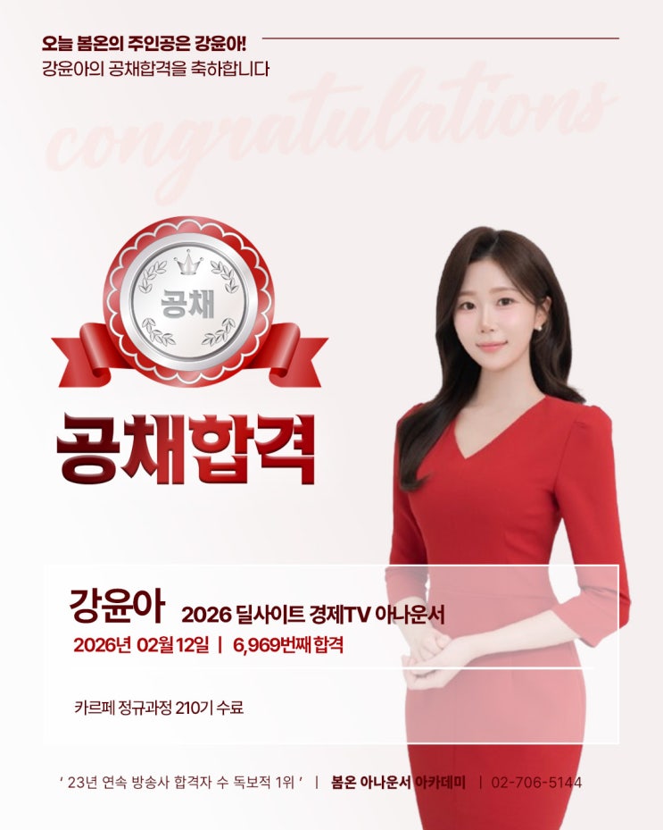 #봄온인의합격을축하합니다 #공채합격 봄온인의 방송진출을 진심으로 축하합니다. 2026 딜사이트 경제TV 아나운서 / 강윤아 공채합격 카르페 정규과정 210기 수료 강윤아 학생이 공채합격을 했단 소식을 전해왔습니다. 그 동안의 열정과 노고에 감사드리며 모두의 마음을 담아 강윤아 학생의 합격을 진심으로 축하합니다! 앞으로 멋진 방송 활동 기대하겠습니다. 카카오톡 : @봄온아카데미 02)706-5144 #아나운서 #아나운서아카데미 #아나운서학원 #아나운서학원추천 #아나운서합격 #아나운서지망생 #아나운서합격생 #아나운서합격전문 #아나운서합격자 #봄온아나운서아카데미 #봄온아카데미 #봄온아카데미학원 #쇼호스트 #쇼호스트학원 #쇼호스....... <img src="https://blogthumb.pstatic.net/MjAyNjAyMjNfMyAg/MDAxNzcxNzk3MzYxMTE5.EG6oGdBB-kOXcmehsyF3vOm-UZIibyGyy0p1XLeQ-OEg.SWEPGRLCAMxy4BCgekF5VCLbbmj2ciGYDj1qufT8Jwcg.JPEG/KakaoTalk_20260223_065303690.jpg?type=s3" />