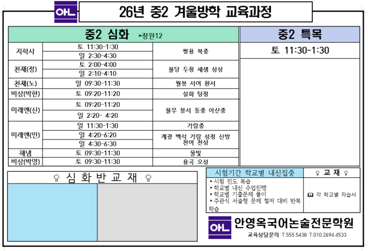 중1 심화반에서는 교재를 바탕으로 문학·독서·어휘 학습을 진행하며, 매주 지정된 도서 또는 에세이를 읽고 서평을 작성하는 활동을 함께 합니다. 또한 1학기부터는 서술형 평가 대비 글쓰기와 내신 대비 문법 학습도 병행하여 진행할 예정입니다. 중2 심화반에서는 중학 국어 전반에서 활용되는 문법 학습을 중심으로 수업이 진행됩니다. 또한 사회·과학 분야의 읽기 자료를 활용해 비문학 지문 대비를 함께 합니다. 1학기부터는 고전문학·고전 어휘 학습과 더불어 중간고사 내신 대비도 진행됩니다. 중2 특목반은 모의고사 테스트를 통해 선발되며, 방학 기간에는 심화반과 동일한 교재를 사용하되 고등 과정과 연계된 심화 문법을 중심으로 수....... <img src="https://blogthumb.pstatic.net/MjAyNTEyMDVfMzAg/MDAxNzY0OTI1MjQ5NDkz.4-I3lzaVd6rp6kJSFzD1rozRAtV_2JQ9XFQ3oTmlj8wg.IUbxRlyRF-fL-PuZOLkhK5gTkourLWge51N6tmscyHYg.PNG/image.png?type=s3" />