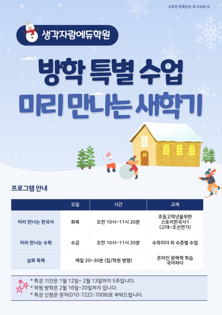 특강 기간 : 1월 12일 ~ 2월 13일(5주간) 학원 방학 : 2월 16일 ~ 20일(5일간) 수강 신청 및 문의 생각자람에듀학원 010-7222-7008 <img src="https://blogthumb.pstatic.net/MjAyNTEyMTdfMjkg/MDAxNzY1OTQ1OTA0NzY0.1hTQXK_eCkqdkpFieqo8BLiLYjyu51JsF35npxdhZaQg.7yXY3MHl0ds6IEEw8NunliA2l0-tNnDeb76626SdfBYg.JPEG/2.jpg?type=s3" />