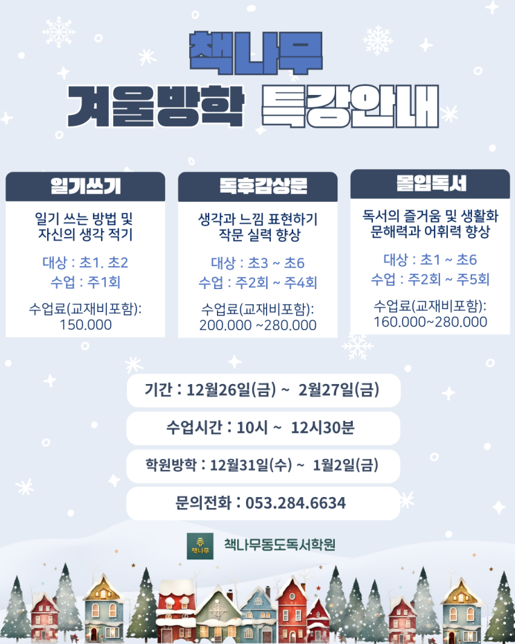 겨울방학의 중요성 ❄️ 자기 주도적 학습·성장 기회 초등학생 시절에 ‘스스로 계획하고 실행하는 경험’을 하는 건 매우 중요합니다. 겨울방학은 시간 여유가 있어 스스로 학습 계획을 세우고 성취감을 느끼며 자기 관리 능력을 키우기에 중요한 시기입니다 ❄️ 기초 학력 다지기에 효과적 학기 중에는 진도를 따라가느라 부족한 부분을 꼼꼼히 다시 보기 어렵습니다 방학 동안에는 국어 독해력 향상 책 읽기 습관 만들기 수학의 기본 개념 복습 이와 같이 기초 실력을 강화하기 좋습니다 ❄️ 새로운 습관을 만들기 좋은 시기 규칙적인 운동, 꾸준한 독서, 계획 관리 같은 장기적 습관을 시작하기 좋습니다 학기 중보다 시간 조절이 쉬워서 습....... <img src="https://blogthumb.pstatic.net/MjAyNTEyMTdfMjA1/MDAxNzY1OTY4MjU0NzY4.fA2zuFJBILGsi-zQognVLRwT3o-uOFKajhmyqyH8ZOkg.RuXeZbVs6aaihR9yX49O4p0Szvd1M32PLWcUyViEy5wg.PNG/KakaoTalk_20251201_194200876.png?type=s3" />