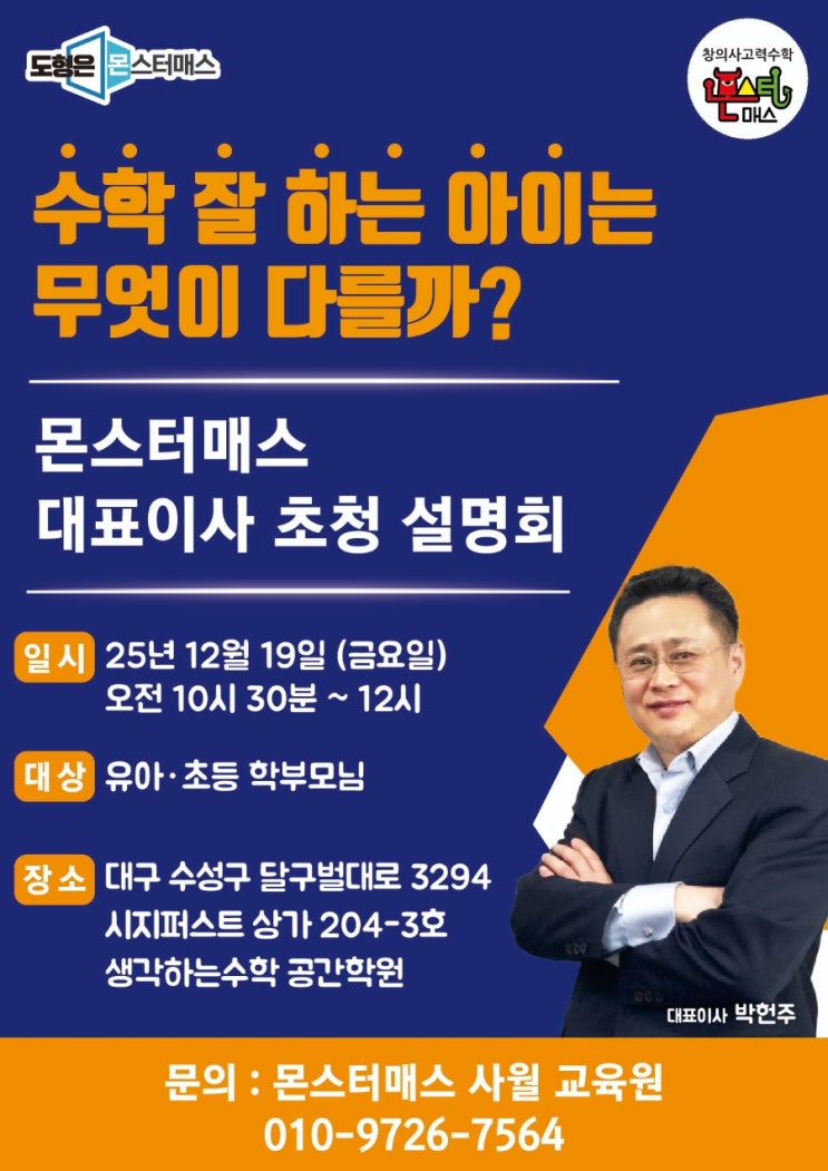 #몬스터매스 대표이사 초청설명회가 있었습니다 이전하고 설명회 1탄은 #미래엔수학 2탄은 몬스터매스 사고력수학 이었습니다 이런저런 정보들을 많이 준비해 오셨습니다 학부모님들도 메모해가며 열심히 들은시는 모습이었습니다 교재도 전체프로그램을 전시해 보았구요 참석한신 분께는 아레테사고력교재도 한권씩 드렸습니다 아기자기한 간식과함께 좋은시간 가지신거 같았어요 이제 설명회도 마쳤으니 아이들과 재미있게 수업만하면 되겠죠~~♡ 상담문의 010-9726-7564 #설명회 #사고력수학 #수성구수학 #초중등수학 <img src="https://blogthumb.pstatic.net/MjAyNTEyMjJfMTQ5/MDAxNzY2NDEzOTg5MTI1.JWi58Fip1S25cYITM4YCQXx3kixkl3-sAMQXtHy6wyIg._HR4MNvloi4Db1l0Cv58mJjIVydJ21mYXBo0W1Ujpu8g.JPEG/1764932050894.jpg?type=s3" />
