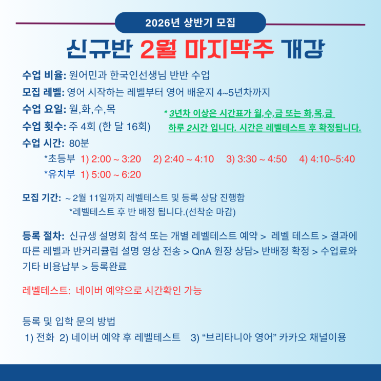 침산동 영어학원 브리타니아 영어 2026년 상반기 신규생 모집 중! (2월 마지막 주 부터 개강) 침산동 학부모님들께 꾸준히 선택받는 브리타니아 영어학원에서 2026년 상반기 신규반 등록을 시작합니다. ✔️ 원어민 + 한국인 선생님 반반 수업 ✔️ 영어 첫 시작 레벨부터 7~8년차까지 체계적인 커리큘럼 ✔️ 주 4회, 탄탄한 학습 루틴 형성 ✔️ 레벨테스트 후 맞춤 반배정 (선착순 마감) 초등부·유치부 수업으로 구성되어 있으며 아이의 현재 실력과 성향에 맞춘 정확한 레벨 진단으로 무리 없는 영어 성장을 도와드립니다. 모집 기간 : ~ 2월 11일까지 개강 : 2월 마지막 주 레벨테스트 : 네이버 예약 가능 문의 방....... <img src="https://blogthumb.pstatic.net/MjAyNjAxMDVfMTg4/MDAxNzY3NTc1ODAxNjE2.gtGZHn-ZTvz0S5zS0V3bJweQEzX-rgMR72C9e9NOCgAg.0yz3hNynPqDzIv1lK0T6EVw-f-YYtnQpUrQ3e7EJO4Yg.PNG/2026%B3%E2_3%BF%F9%281%29.png?type=s3" />