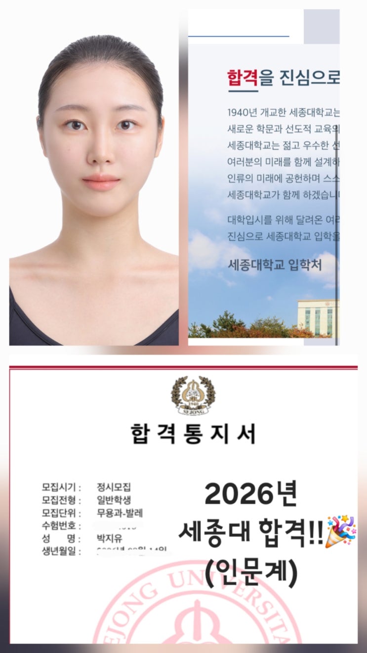 2026년도 세종대학교 발레 합격을 축하합니디 다사다난했던 우리 지유... 울고 웃으며 마음고생, 몸 고생 정말 많이했는데.. 이젠 꽃길만 걷자 지유는 5개월동안 입시 준비한, 반수생 학생이에요. 오랜 고민 끝에 다니던 대학을 과감히 포기하고, 반수 결정하여 5월부터 작품을 고르고 연습하였어요. 중학교 때부터 문제였다던 허리디스크와 목디스크로 무리하게 레슨을 하지도 못했던 상황에 중간중간 통증이 생기면 수업을 중단하고 몇주 쉬곤 했던 터라 답답하고 불안한 마음에 참 많이도 울었어요. 기간이 넉넉했다면 몸을 처음부터 뜯어고치며 하나하나 고쳐나갔을텐데.. 그 또한 허락치 못했기에 준비기간동안 늘 아쉽고 안타....... <img src="https://blogthumb.pstatic.net/MjAyNjAyMDVfMTQ5/MDAxNzcwMjUxNjM4NTY3.bFL7Cce45vM4kKMOO_Z98swd4DPVuQSwI75GiZaBW4Ug.1oFQBBFOBXt-ky42EdW1MjSrojIPSBsKioonXoLfwrMg.JPEG/900%A3%DF20260205%A3%DF011302.jpg?type=s3" />
