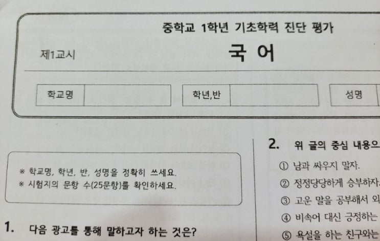 각 학교에서 3월 학기 초에 실시하는 진단평가를 대비하여 저희 채움국어에서도 예비중1, 예비중2학년을 대상으로 [기초학력진단평가]를 실시합니다. 총 30문항으로 40분정도 소요됩니다. 실전처럼 시험을 치르기 때문에,학생의 현재 실력을 점검하는 좋은 기회가 됩니다. "수능과 내신을 한번에, 소수정예밀착관리" 중계채움국어논술 010-4865-8996 중계 은행사거리 마들프라자3층 <img src="https://blogthumb.pstatic.net/MjAyNjAyMDhfMjUx/MDAxNzcwNTMxNzQ2NTM4.7Ijs5cL5kH0pFBkAY22rZM-QRkD91_uNohyZjESagDMg.yhgilG2kPJJdivivk3BQwFZHjDLFjMr2WHzhDE4fUgog.JPEG/900%A3%DF20260208%A3%DF151851.jpg?type=s3" />