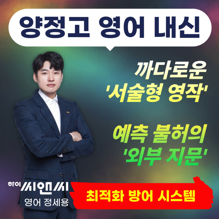 안녕하세요! 하이씨앤씨학원 양정고 영어 내신 전문, 정세용 팀장입니다. 본격적인 1학기 중간고사 시즌이 다가왔습니다. 중학교 시절 영어 A등급을 놓치지 않던 학생들도 양정고의 첫 시험지 앞에서는 당황하기 일쑤입니다. 양정고 내신은 단순 암기만으로 통하지 않습니다. 오늘 그 결정적 차이를 만드는 킬러 문항의 실체와 하이씨앤씨만의 맞춤형 솔루션을 공개합니다. 1. 양정고 영어, 등급을 가르는 '2가지 핵심 킬러' 수년간의 기출 분석 결과, 최상위권 변별력은 결국 여기서 결정됩니다. 변별력 1. 까다로운 '서술형 영작' 단순 배열이 아닌, 핵심 어법(수일치, 시제, 분사구문 등)을 활용해 조건에 맞춰 문장을 완....... <img src="https://blogthumb.pstatic.net/MjAyNjAzMTdfMjcz/MDAxNzczNzQ5MzI0ODYx.Xp2_ovesHFUlpfuz7ENkuiUqtPJnom4rA19P5TFxMykg.pNkJf_KZKyd4gAANgWugOFbnX3xssPLa2pIS8dV8e2Ig.PNG/%C1%A4%BC%BC%BF%EB_%281%29.png?type=s3" />