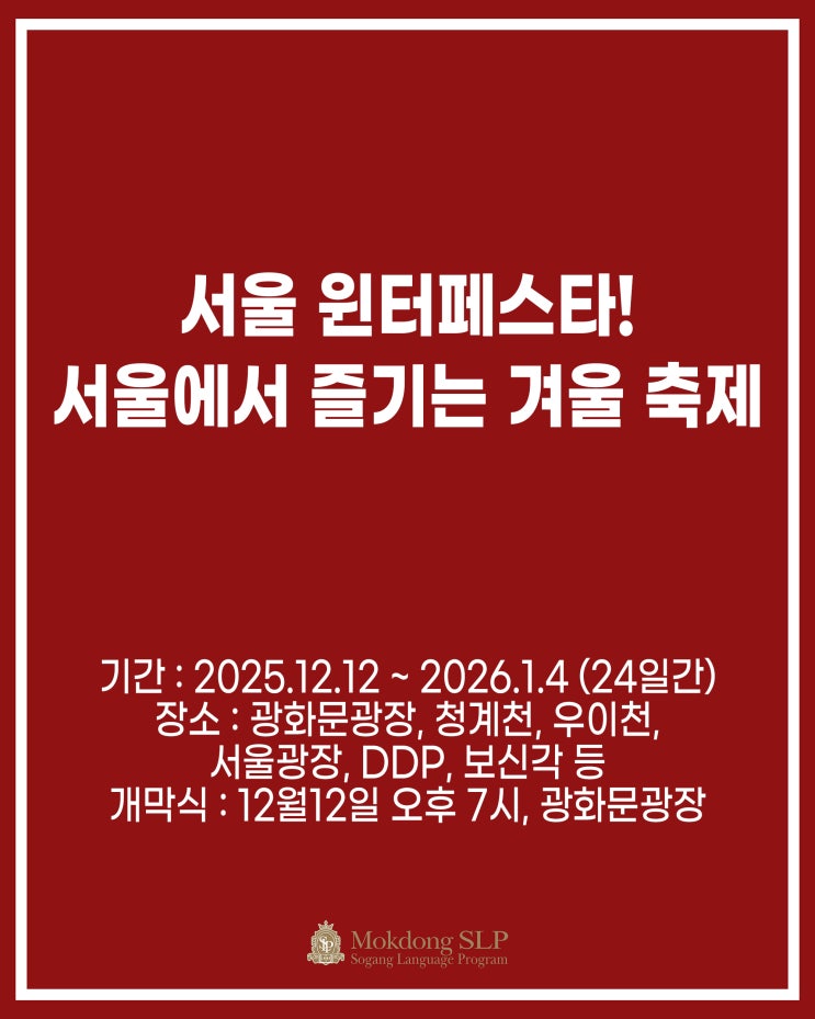 안녕하세요, 목동 SLP입니다. 어디에 데리고 갈지 고민되는 겨울방학과 아이들이 일 년 내내 기다린 크리스마스가 다가오고 있는데요! 겨울 분위기, 크리스마스 분위기는 즐기고 싶지만 아이랑 멀리 나가는 것이 부담스럽다면? 올 해도 돌아온 <서울 윈터페스타>! 서울에서도 겨울 축제를 맘껏 즐길 수 있어요. 오늘은 서울 윈터페스타 행사 정보를 소개할게요. 기간 : 2025.12.12 ~ 2026.1.4 (24일간) 장소 : 광화문 광장, 청계천, 우이천, 서울광장, DDP, 보신각 등 개막식 : 12월 12일 오후 7시, 광화문광장 서울 윈터페스타란? 12월 12일부터 1월 4일까지 서울에서 열리는 일곱가지 축제! 행사가 진행되는 장소는 위 지도에서 한 눈에....... <img src="https://blogthumb.pstatic.net/MjAyNTEyMDhfODQg/MDAxNzY1MTc5MDY5NDQ2.FpSWF5S4hj_5JKBWCcYnCBwQdw1iAl4r1qyPZeHndMYg.2OEp8-7wHIPlPPHNNU6Jr6s8jWGwAgb00j1yyjD7awkg.JPEG/%C7%A5%C1%F6_%BA%B9%BB%E7.jpg?type=s3" />