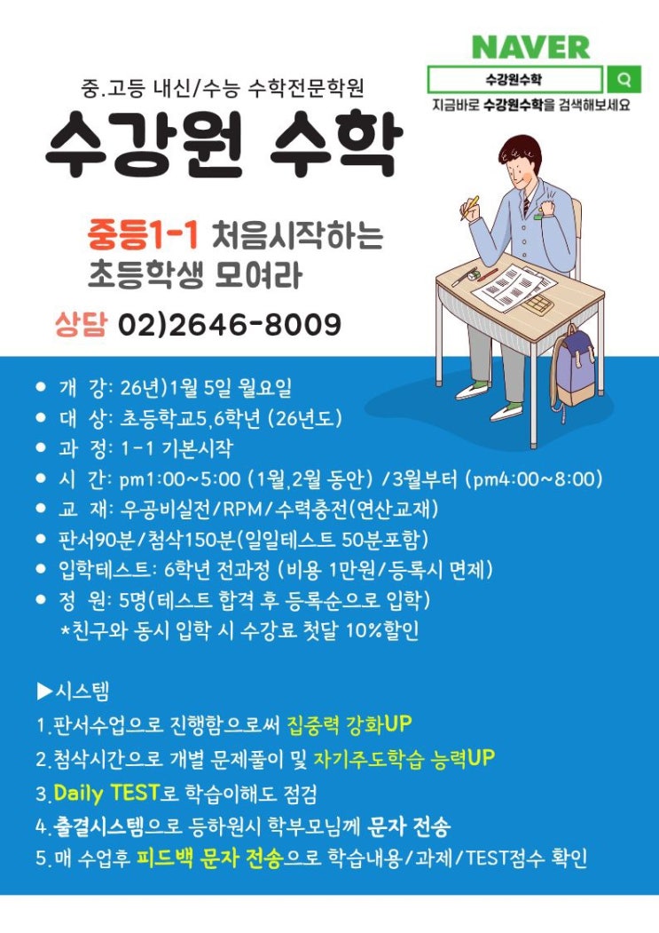 *6학년 2학기까지 마무리 된 학생만 입학테스트 응시 가능합니다. *입학테스트 후 상담이 진행됩니다. (테스트 점수로 입학여부가 결정 될 수 있습니다) *수강료 : 회당 42,000원이며 한달 12회기준 50만원 *소개로 등록시 소개비할인 있습니다. (등록전 말씀부탁드립니다.) *친구와 동시 입학 시에는 첫달 수강료 각각 10% 할인 있습니다. *최소 정원 미달시 폐강 될 수도 있습니다. 문의)02-2646-8009 / 010-2954-8009 <img src="https://blogthumb.pstatic.net/MjAyNTEyMTJfMjUw/MDAxNzY1NTMyMjc5MjYz.W85eofJxau7Bs8vz3uhFk840pqyYQ8jAsld74IHTduog.5C4VIwLXKeGMPudS02PBUpla75-TmQRQUIp4zUVynxMg.JPEG/IMG%A3%DF0130.JPG?type=s3" />