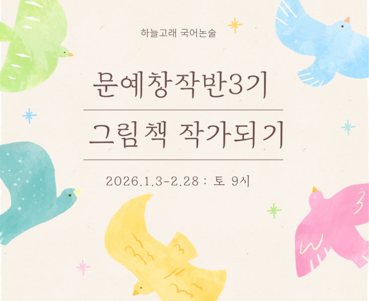 문예창작반의 이야기를 들려드리려 합니다. 1기 : 14명의 작가님께서, 동화 한편과 동시 4편을 쓰고 작품을 모아 한권의 책으로 출판 완료. 2기 : 9명의 작가님께서, 각각 동화와 동시를 담은 책을 개인당 한 권씩 출판 (2026년 2월 출판예정) 3기 : 그림책 한권을 개인당 한 권씩 출판(2026년 3-4월 출판예정) 하늘고래 재원생이 아닌 경우, 별도의 레벨테스트가 진행됩니다. 현재 모실 수 있는 잔여석이 많지 않으니 빠른 결정 부탁드립니다. 1.2.3기를 모두 듣고 있는 친구들이 많아, 좋은 작가님과 커리큘럼을 위해 최선을 다하느라, 교육과정 안내가 늦었습니다. 문학이 주는 위로와 창작의 희열을 작가로서 경험할 수 있도록 잘 준비하였습....... <img src="https://blogthumb.pstatic.net/MjAyNTEyMTNfMjU4/MDAxNzY1NjIzOTk5ODMz.KtGZMeydzIrn-Nq6ncIs3_ZovzAQ3ZkR8Z5wcr1n9H4g.S5v28Wc1GvfF81haO-2yMB9fbn3b9BpXBpLz_CqUWrwg.PNG/%C1%A6%B8%F1%C0%BB-%C0%D4%B7%C2%C7%D8%C1%D6%BC%BC%BF%E4_-001_%284%29.png?type=s3" />
